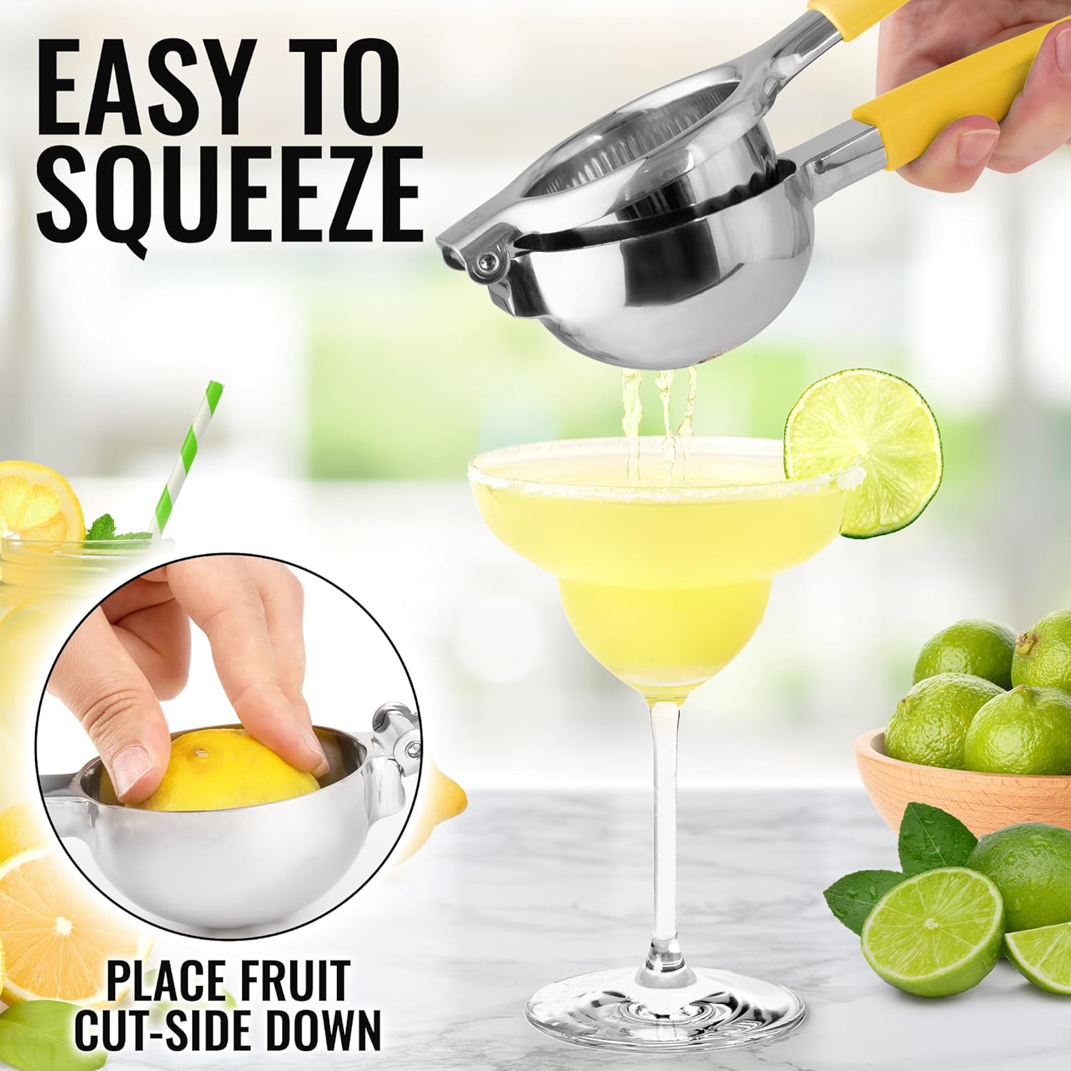 - MADE WITH HIGH QUALITY STAINLESS STEEL: This Easy-To-Use and Easy-To-Store Lemon Squeezer is built like a tank. No more bulky hard-to-clean juicers crowding the decor of your home bar or kitchen this citrus press has you covered. Whether you’re a chef or simply want a pampered squeeze you can be drinking lemonade in a just seconds.