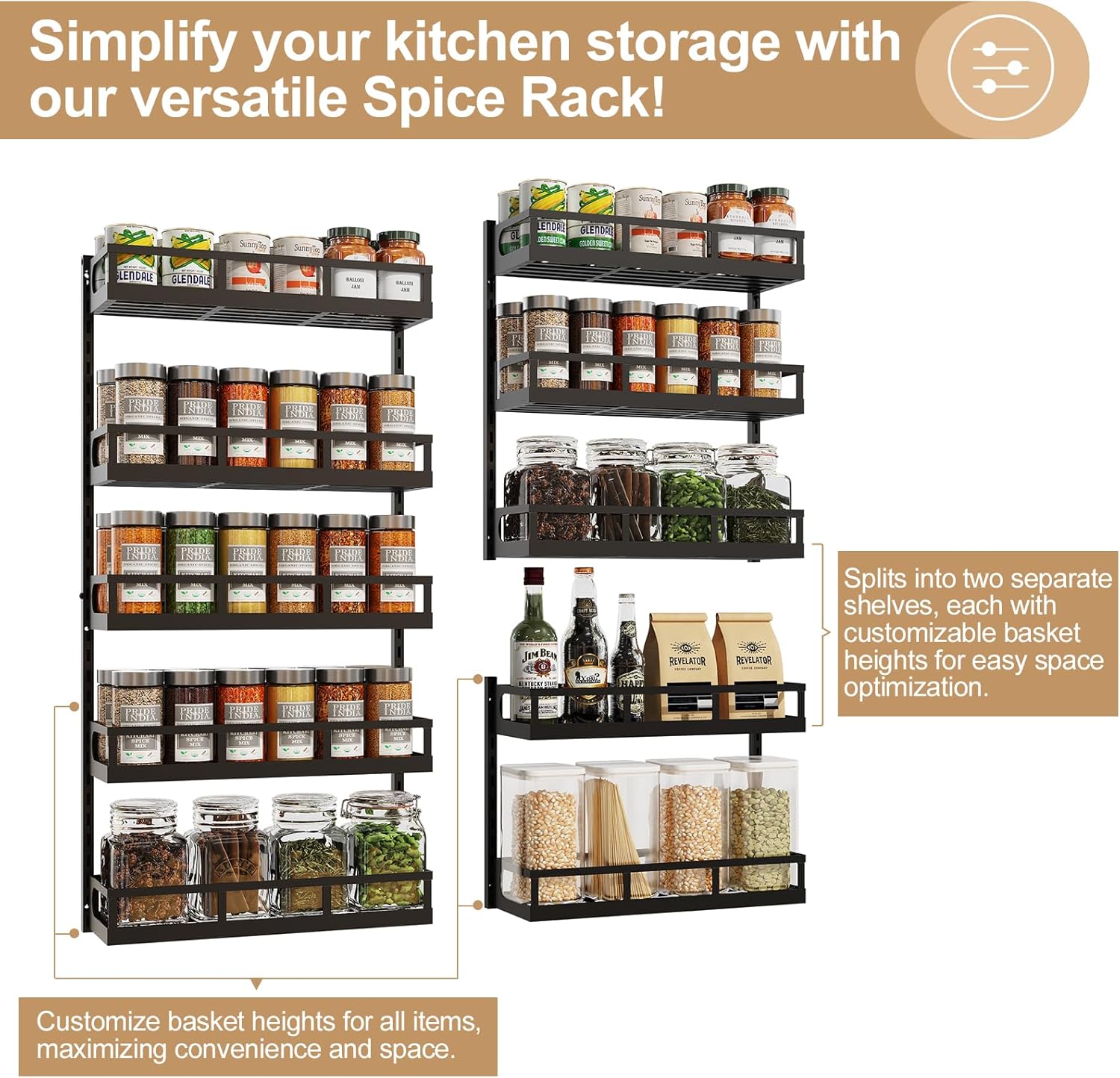 - DUAL-USE DESIGN: This spice rack organizer can function as a single 5-tier rack or be separated into two racks, making it perfect for any kitchen space. Whether you prefer wall-mounted, or cabinet-placed organization, this spice rack offers a tidy solution.
