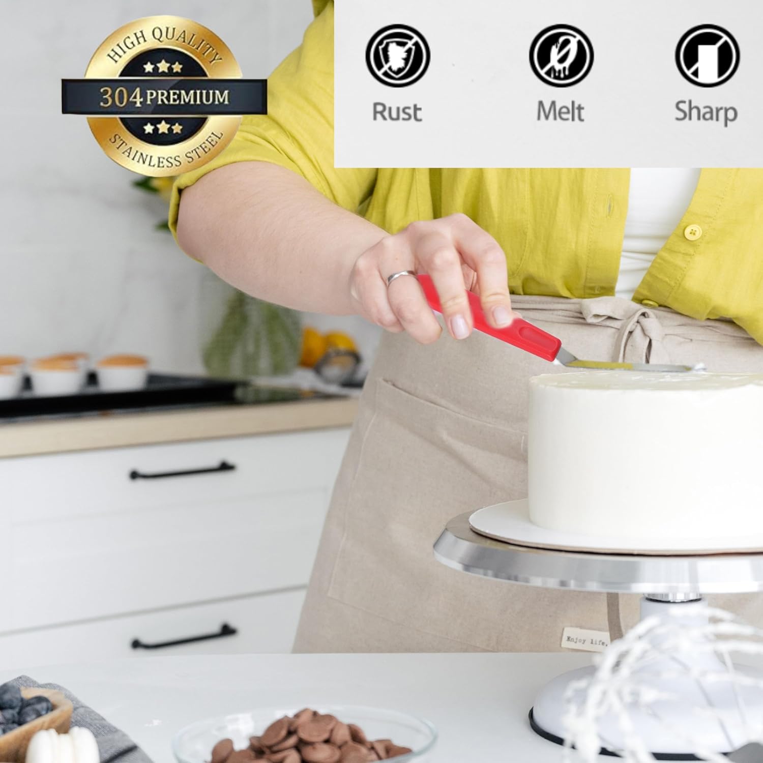 - Angled blade makes it super easy to ice or top a dessert in a pan, and more flexible so that you can control them better.