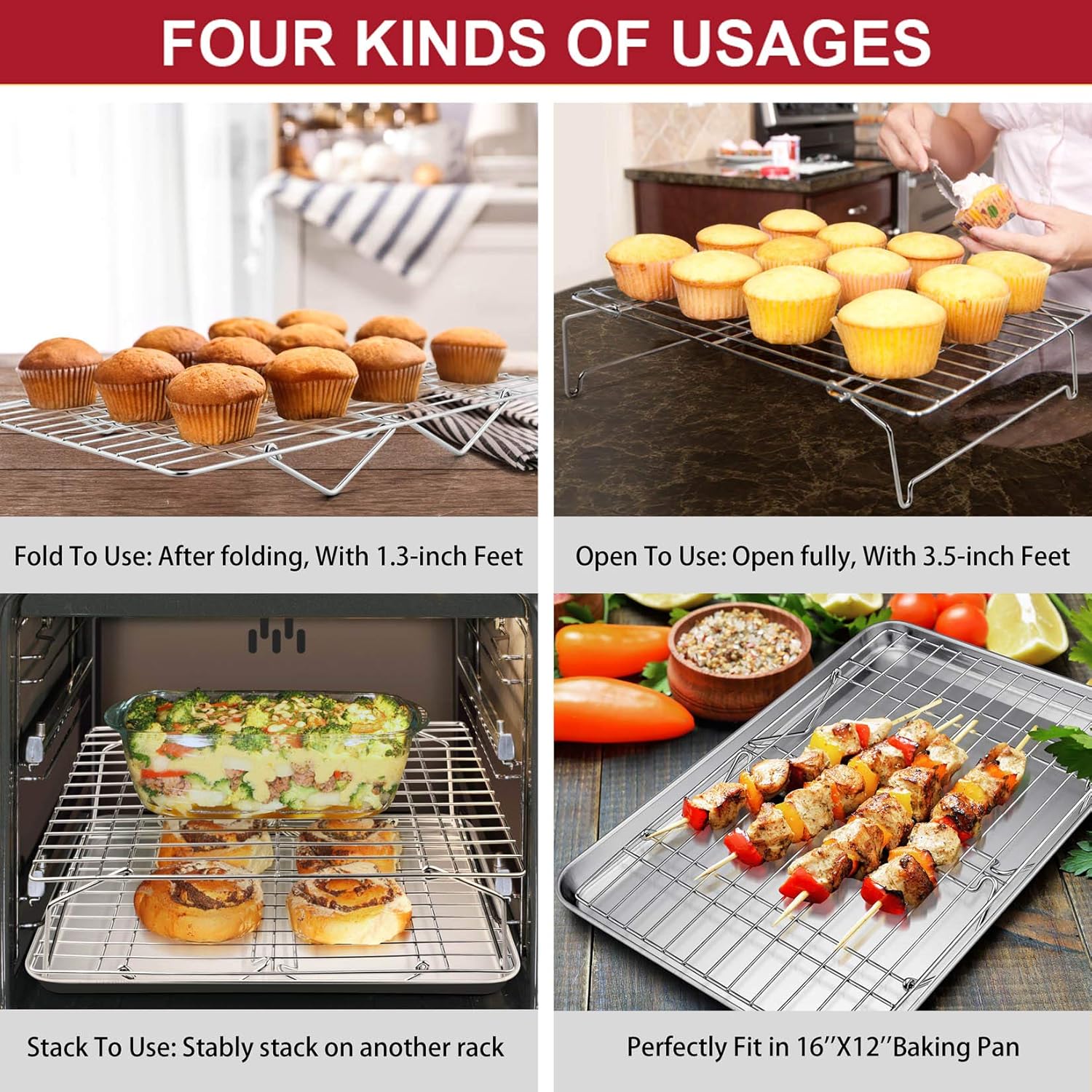 - 【ADJUSTABLE】 The flexible feet can be swung over 90°, Come with 3.5-inch height when it expanded fully, Make the rack stack stably on another rack, Provide higher and larger space to cool and bake more food at once, Collapsible feet for easily folding to 1.3-inch height, Easy storage in your cabinet or drawer