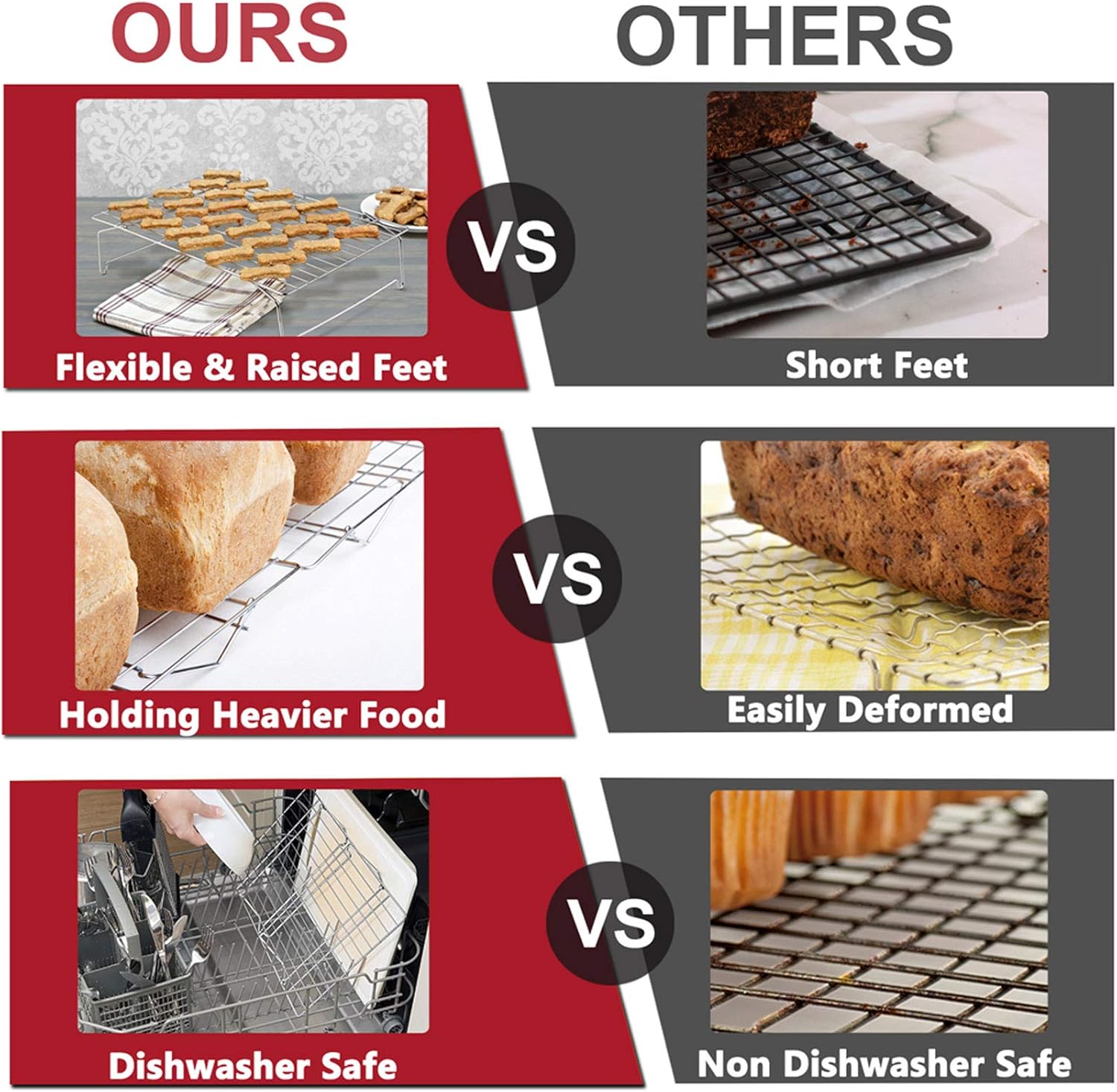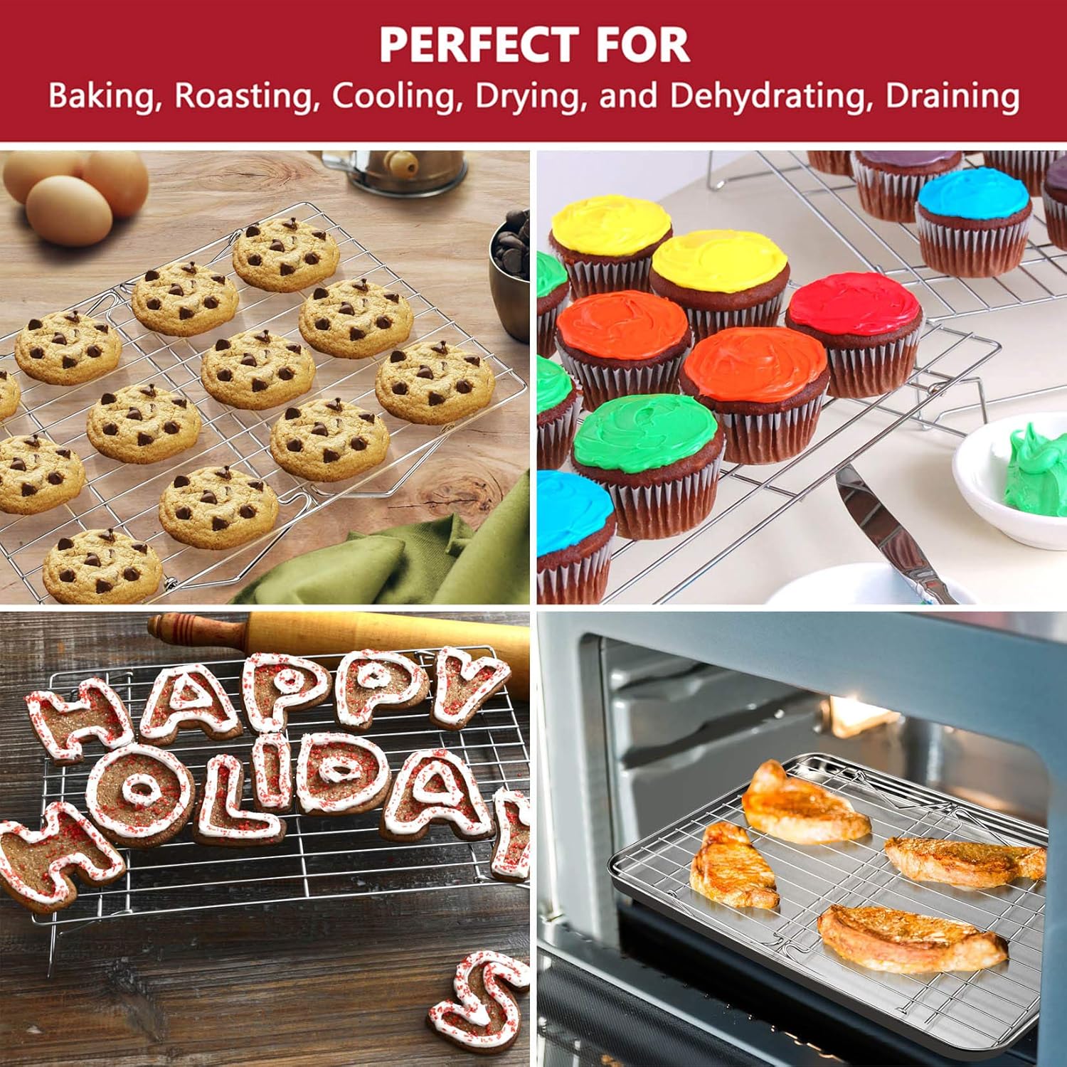 - 【OVEN & DISHWASHER SAFE】 Elevated feet and equidistant wires promote optimal air circulation to quicken the baking and cooling process, Perfectly fit most regular oven for baking and roasting, Dishwasher safe to save your cleaning labor and reduce the hassle after using, Also hand-wash easily