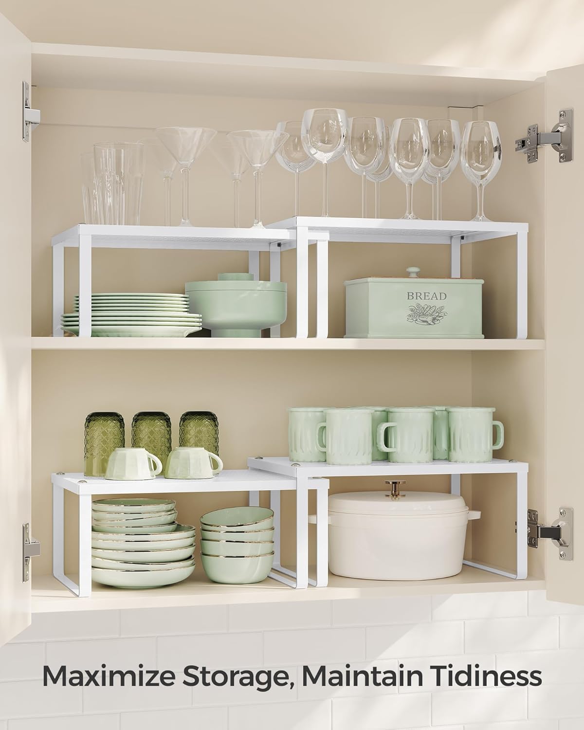 - [Maximize Your Storage] If you have a large cupboard but your items still have nowhere to go, try this set of 4 cabinet organizers—it takes full use of the vertical space and doubles your storage space