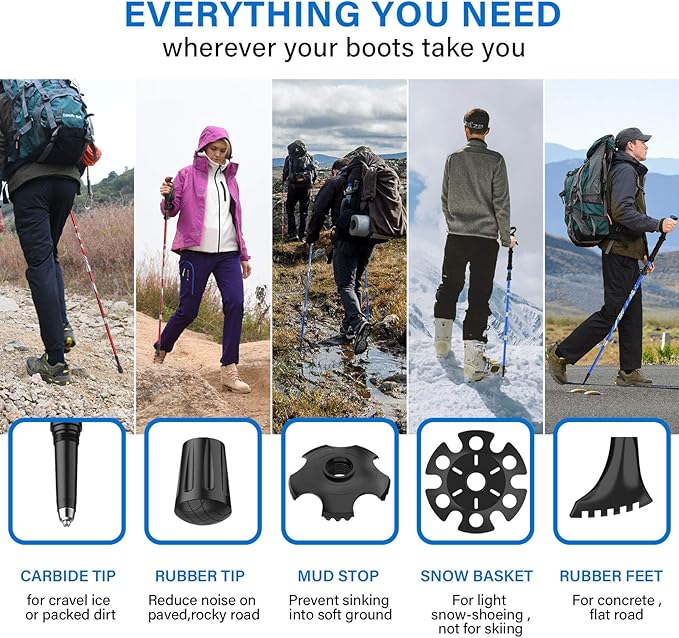 • 【ALL TERRAIN, ALL CONDITIONS】From climbing ice mountains to an easy urban walk, heavy-duty 4 season accessories (1 pair of each rubber tips, boot tips for hard surfaces, snow baskets, mud & sand baskets) and a tungsten carbide tip won’t let you down. 1 pair of carrying bags for storage and transport is also included in this hiking gear.
