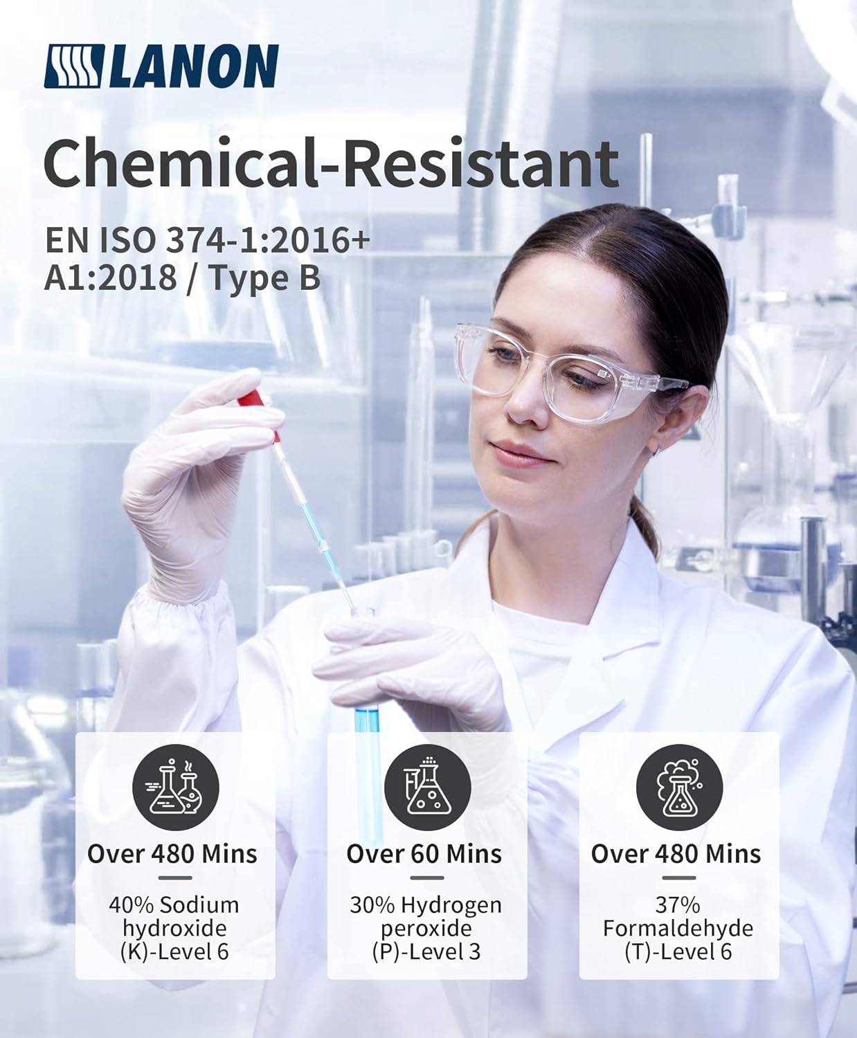 - Next-Level Performance - EU Certificated, CAT III, with Standards EN ISO 374-1:2016+A1:2018 / Type B, EN 374-4:2013, EN ISO 374-5:2016. The three EN ISO 374 test chemicals: K-Level 6, over 480 min; P-Level 3, over 60 min; and T-Level 6, over 480 min. The rolled cuff is easy to wear and remove, prevent tearing during donning.
