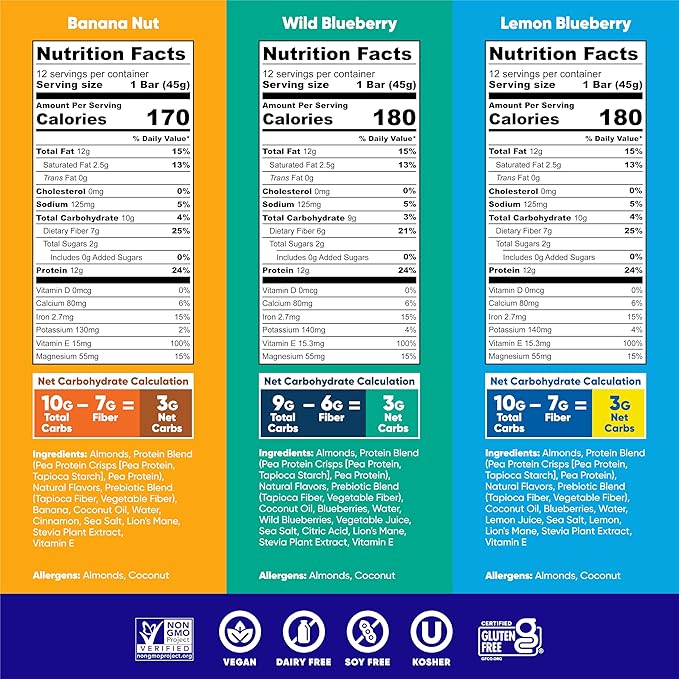 • KETO FRIENDLY SNACKS w/ Only 3g Net Carbs in Every Serving - Net carbs are carbs that are absorbed by the body, and our keto treats come with only 3g of net carbs in every serving. Each keto plant based protein bar is packed with 9-10g of total carbs, 6-7g of fiber, 12g of fats & 170-180 calories. Enjoy our 3 flavors Lemon Blueberry, Banana Nut, Wild Blueberry