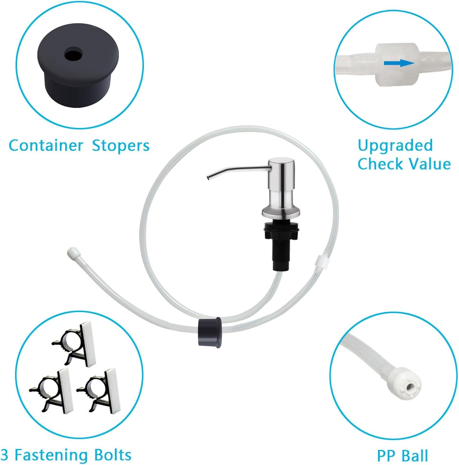 - PACKING INCLUDING -- 1 x soap dispenser pump head, 1 x 47" extension tube, 1 x soap bottle stopper, 1x check valve, 1x PP ball, 3x fastening bolts