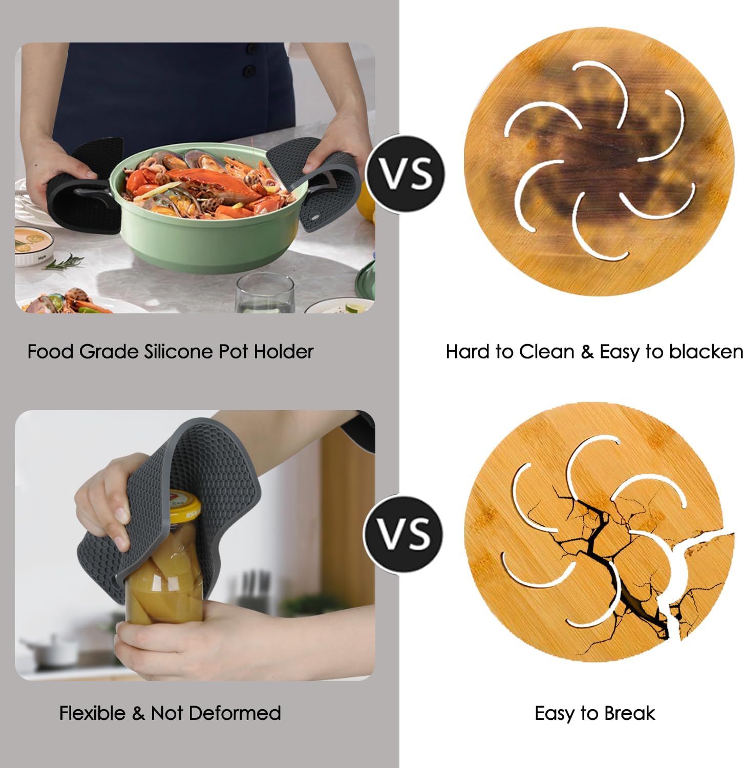 Silicone Trivet Mats, 4 Pack Silicone Pot Holders for Hot Pan and Pot Pads, Heat Resistant Counter Mats for Tables, Countertops, Spoon Rest and Large Coasters, Black & Gray (2 Squared + 2 Round Mats)