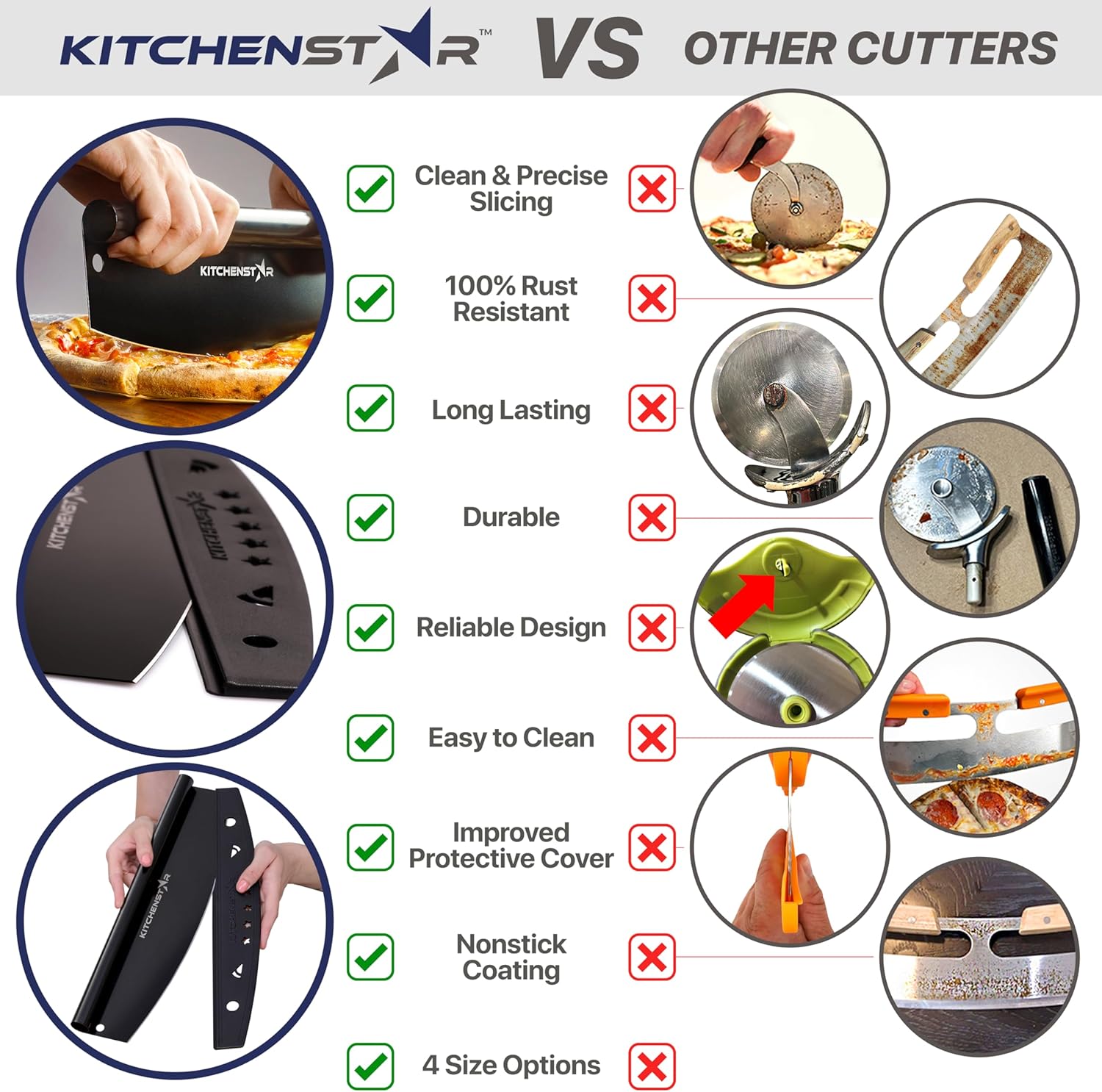 KitchenStar 16-Inch Pizza Cutter Rocker Blade - Sharp Stainless Steel Slicer Knife, Protective Cover, Black Nonstick, Large - Professional Pizza Oven Accessories