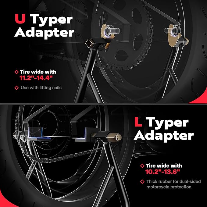 • ADAPTABLE FORK HEAD - Our motorcycle rear stand features a U-shaped fork head support with an adjustable range from 11.2 to 14.4 inches; For flexibility, we offer two L-shaped fork heads, allowing for adjustments between 10.2 and 13.6 inches; These customization options ensure solid support from all sides, making the stand suitable for various types of motorcycles; Verify motorcycle compatibility before buying, we recommend using matching stand screws for optimal fit
