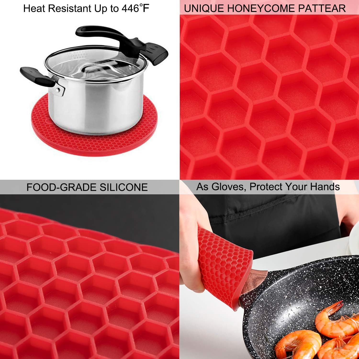 - 【LIGHTWEIGHT & HEAT RESISTANT】- These red silicone trivet mats set are heat protection and insulated as a protector for countertops, tables, stoves, or others. Heat-resistant temperature from -40°F-446°F(-40°C to 230°C), the heat resistant table mat is safe for use in the oven, freezer, microwave, and as a trivet mats, potholder, desk pad, kitchen mat trivet, jar opener, spoon rest, or anywhere you need extra grip or extreme heat.