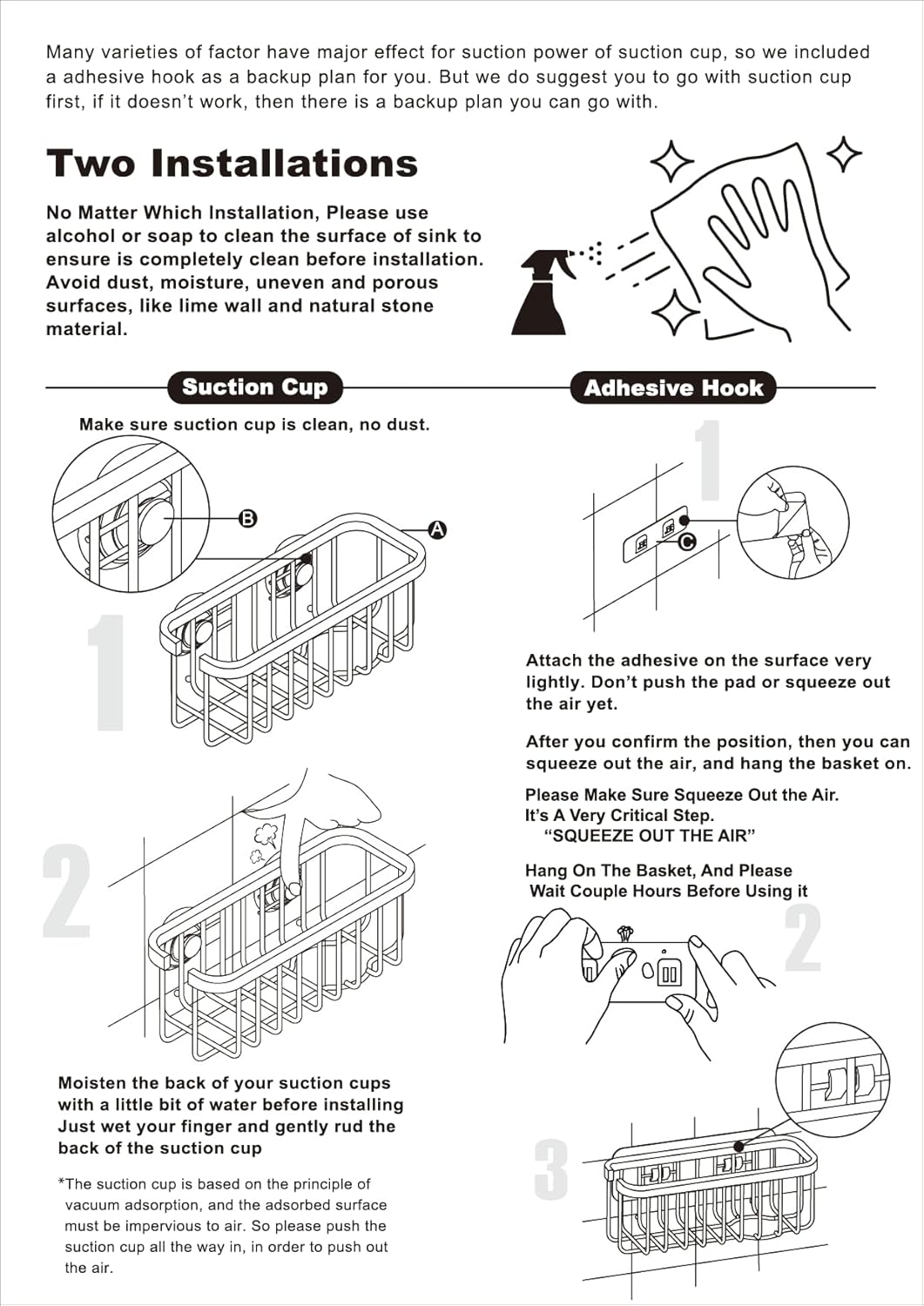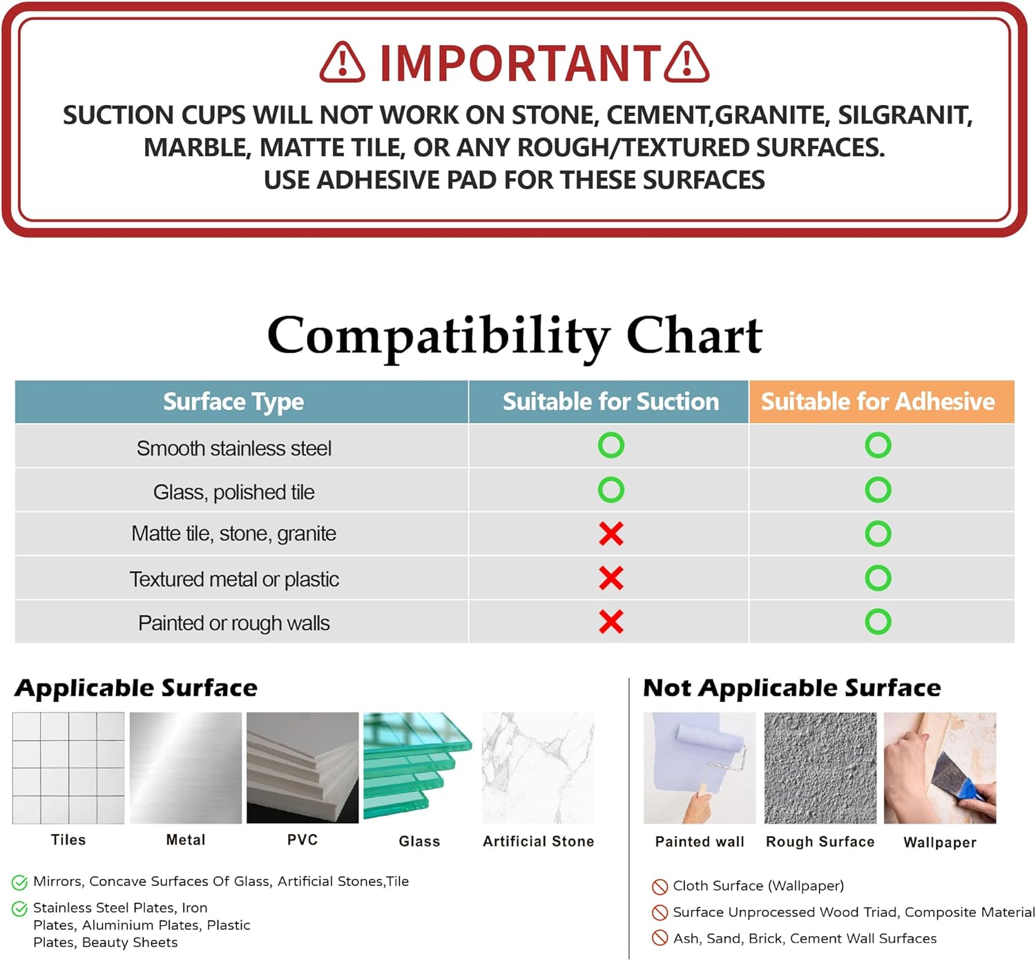 - This product includes the stainless steel basket and mounting accessories (adhesive pad + suction cups). Important Compatibility Notice – Suction cups work only on smooth, non-porous surfaces such as polished tile, stainless steel, or glass. For textured, stone, or matte finishes, use the included adhesive pad instead.