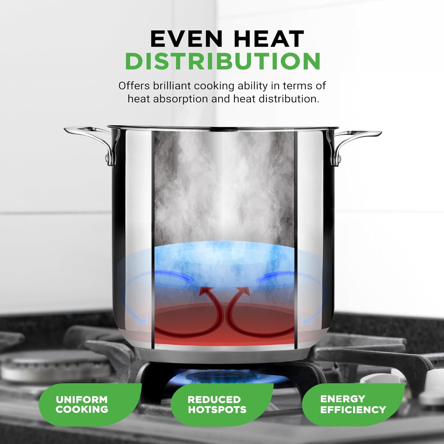 - FOOD-GRADE STAINLESS STEEL: Made of 18/8 non-reactive stainless steel interior which is non-toxic, non-allergic & safe for cooking. It has an impact bonded base for even heat distribution w/ base thickness of 0.228” & pot dimension of 16.45”x12”x13.4”