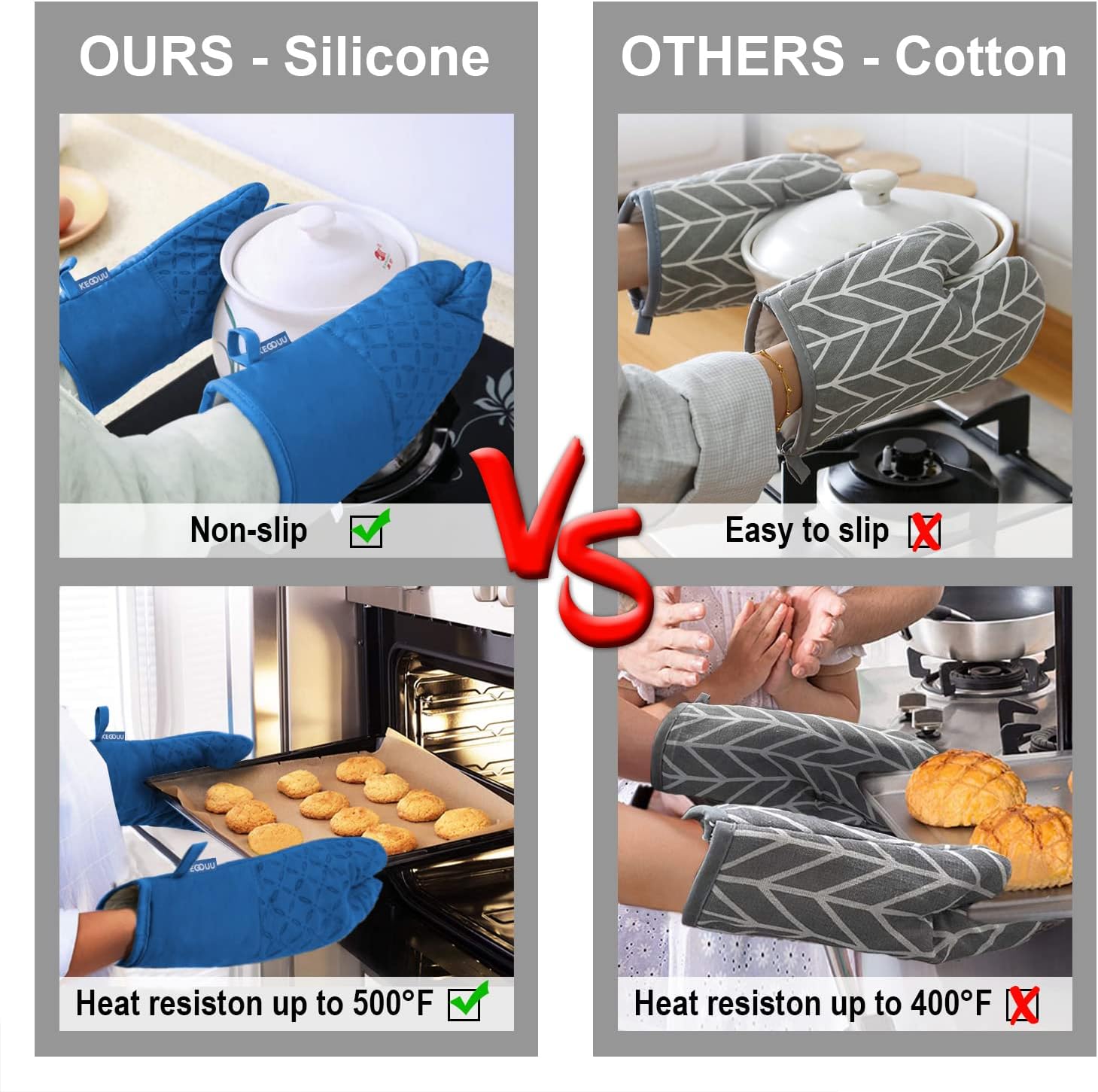 - 500°F HEAT RESISTANT &NON-SLIP - This oven mitts heat resistant 500 degrees because of the durable construction so it can effectively keep you protected from burning while you enjoy cooking and grilling. Enhanced with anti-slip silicone design to provide a more robust, non-slip grip that can be held securely when handling the kitchen utensils