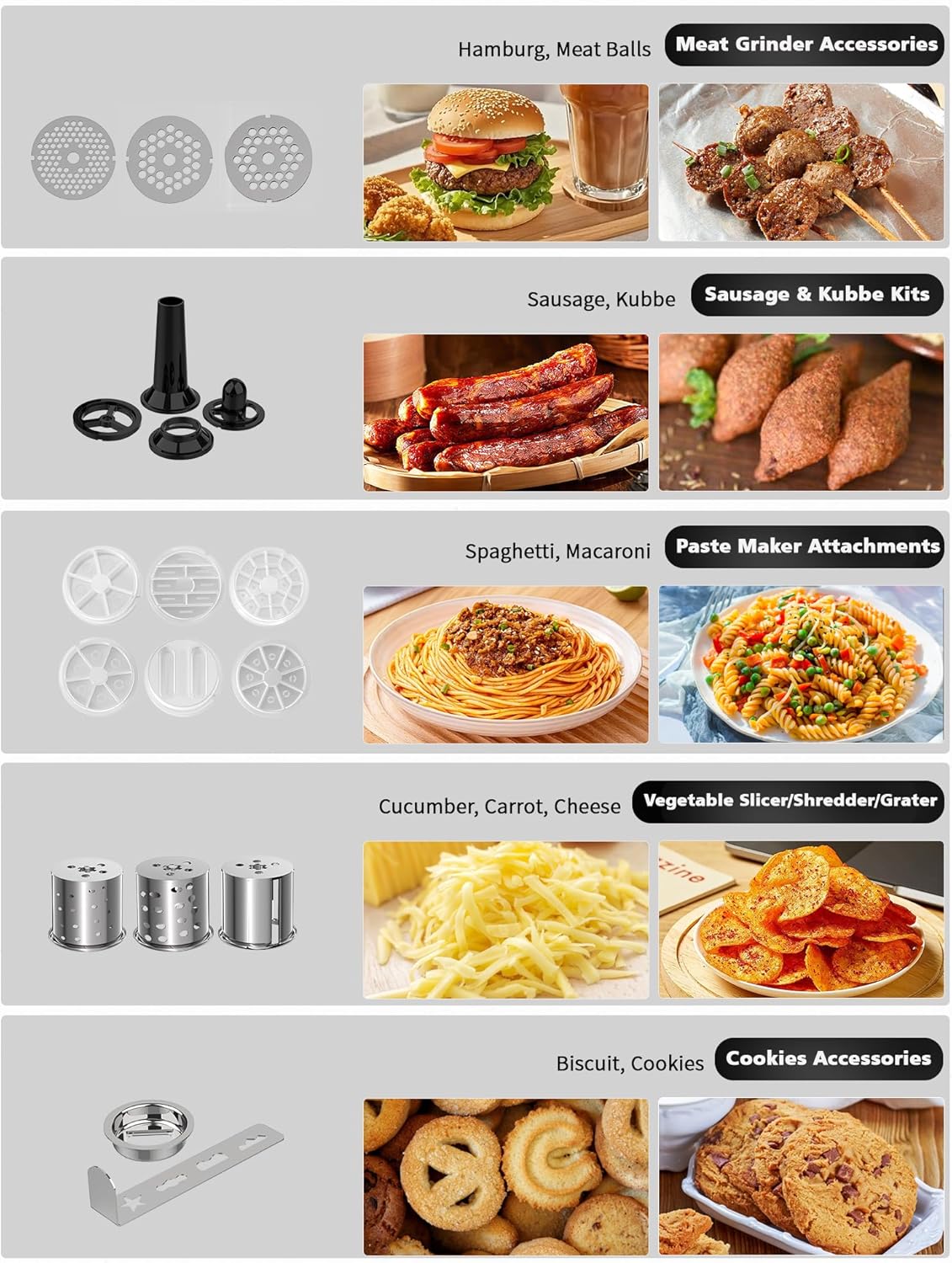 - 9-in-1 KITCHEN MACHINE - Vospeed kitchen stand mixer is a multi-functional food processor. It is equipped with a dough hook, whisk, beater, juice blender, meat grinder! Itโs a perfect kitchen helper for making cakes, bread, cookies, smoothies, juicer,salad, sausage, meat sauce etc. The splash guard helps to add ingredients without making a mess