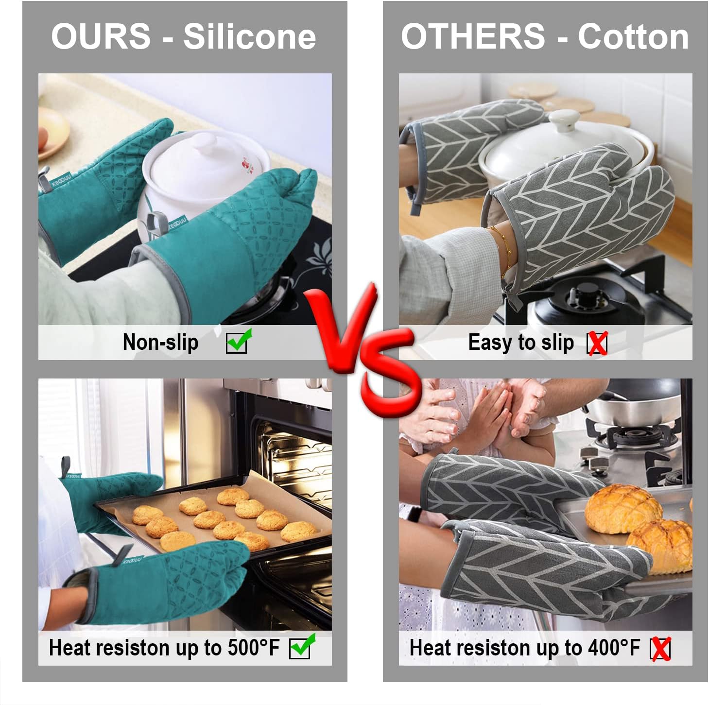 - 500°F HEAT RESISTANT &NON-SLIP - This oven mitts heat resistant 500 degrees because of the durable construction so it can effectively keep you protected from burning while you enjoy cooking and grilling. Enhanced with anti-slip silicone design to provide a more robust, non-slip grip that can be held securely when handling the kitchen utensils