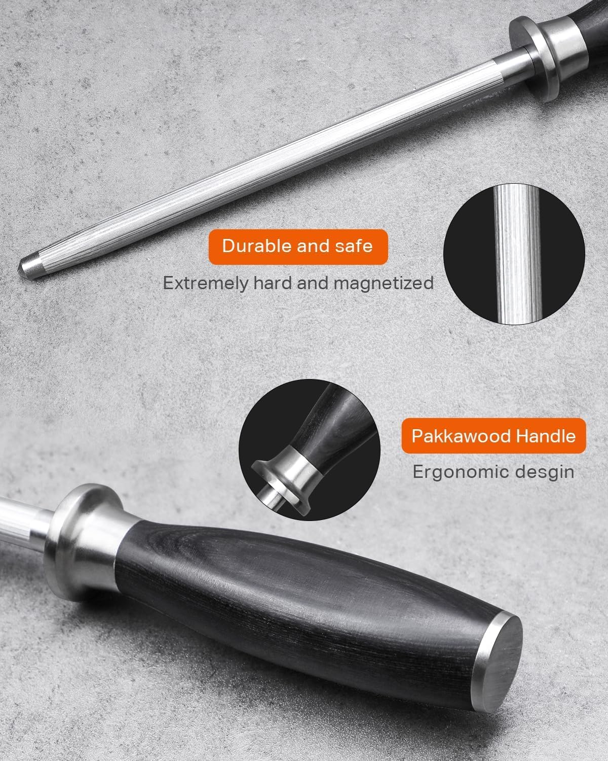 - SAFE & ERGONOMIC HANDLE: Designed with comfort and safety in mind, the anti-slip Pakkawood handle ensures a secure grip while using the knife sharpener rod. The ergonomic shape allows for comfortable handling and precise control, while the widened bolster protects your hands from the blade.