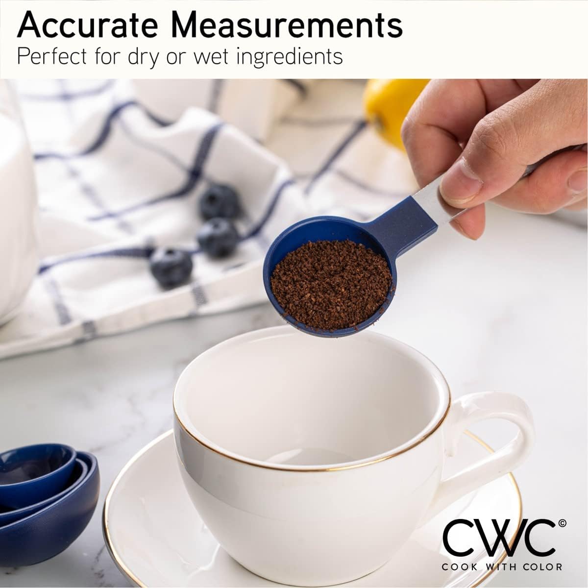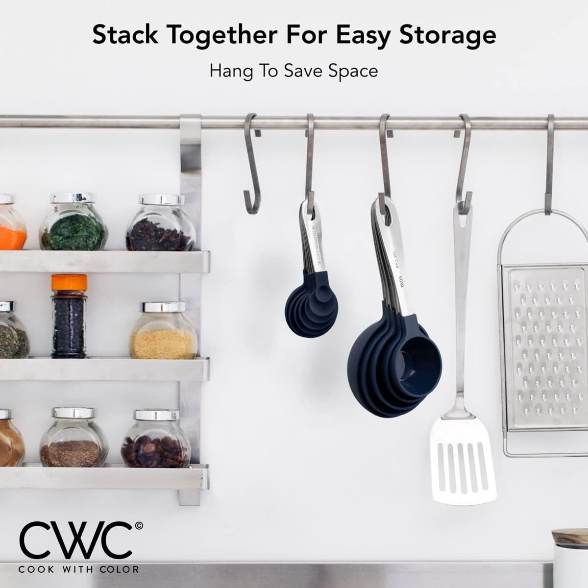 - Cook with Color's set of measuring cups and spoons will bring a pop of color to your recipe prep with an easy to use measure set with all the basics still intact.|Round plastic smooth edged cups and spoons with copper coated stainless steel handles β sizes engraved in handles in US and metric measurements that will not rub out or fade.|Measuring cups: 1 cup 3/4 cup 1/2 cup 1/3 cup and 1/4 cup; Measuring spoons: 2 Tbsp. 1.5 Tbsp. 1 Tbsp. 2 tsp. 1 tsp 1/2 tsp. 1/8 tsp.|Set nests for compact and easy storage; hand wash with warm soapy water. Boxed and ready to be gifted. Perfect gift for family and friends.|CUSTOMER SATISFACTION GUARANTEE - At Cook with Color our #1 goal is customer satisfaction please do not hesitate to reach out to us with any issues or comments so we can ensure that your Cook with Color order experience adds just the right color and taste!