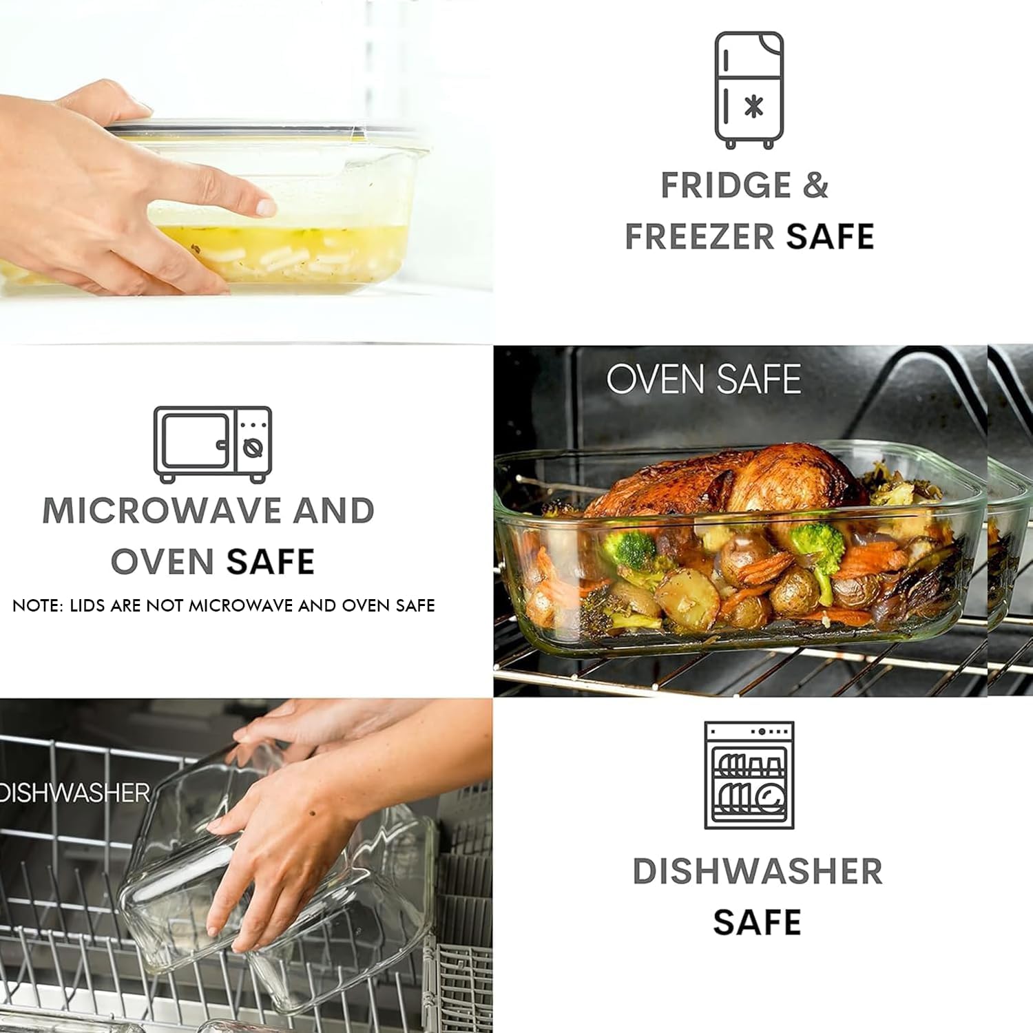 - Leak Proof Storage: Container set Is Easily Sealed, Air Tight And Spill Proof - Rectangle GLASS FOOD CONTAINERS- Keep Leftovers Fresh, Goes Straight From The Refrigerator To The Microwave Or Oven To The Table. Food Can Be Cooked Directly In The Containers Using Microwave Or Oven. Less dead space while storing in refrigerator due to Rectangle shape.