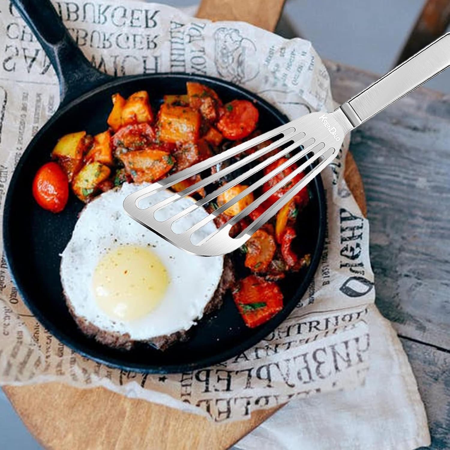 KSENDALO Fish Spatula Stainless Steel, Egg Flipper Spatula with Thin Flexible Slotted and Angled Blade for Kitchen Cooking, Grill, Camping, Essential Metal Spatulas,Silver Kitchen Utensils Set