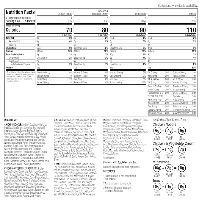 • Delicious Protein Soup: Savor the rich flavors of our protein-packed soup, a delicious option that satisfies the taste buds with every spoonful. Made with only 110 calories and 1.5g fat or less per serving, this wholesome meal can be enjoyed without the guilt!