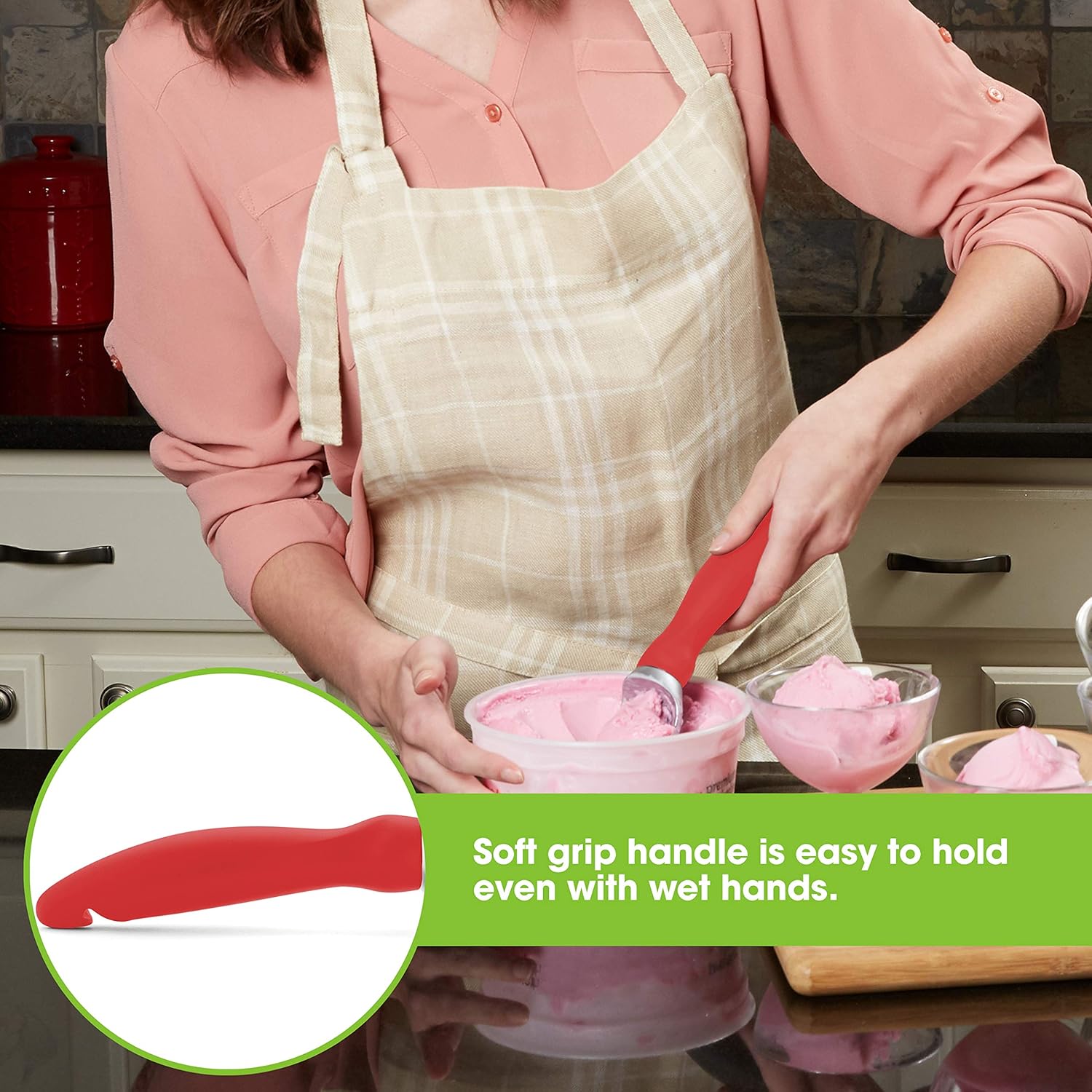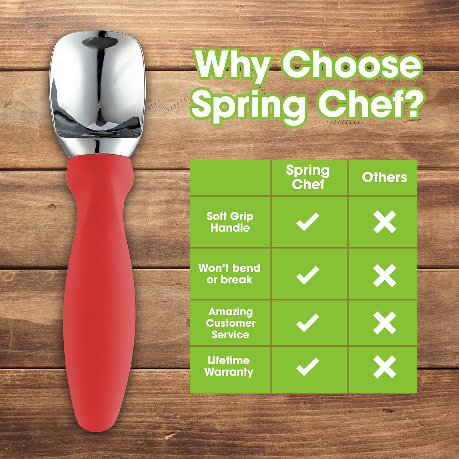 - Why Struggle With A Bad Scoop - With its pleasant weight, ability to get into hard-to-reach parts of a carton and excellent handling of hard ice cream, Spring Chef’s scoop does the heavy lifting. The soft grip handle is comfortable to hold, easy to grip, absorbs pressure and doesn't freeze your hand like scoops with a metal handle can. No antifreeze gimmicks. Simple yet ergonomic design that is easy to clean and will make scooping even easier.