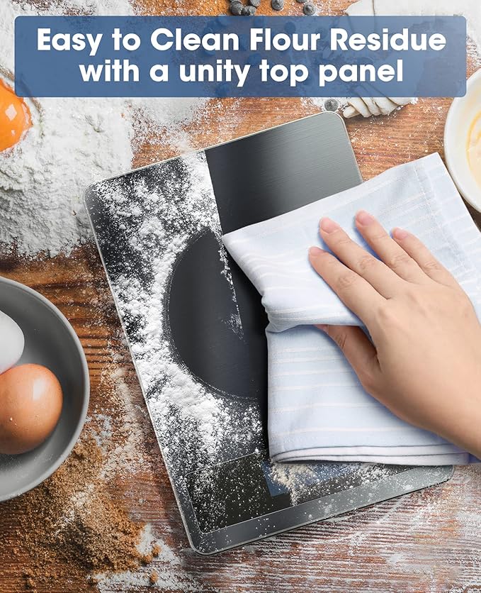 • PRACTICAL DESIGN: The food scale is designed with tempered glass for strong bearing, sleek stainless steel top surface for anti-fingerprint and easy clean, with a attached hook for convenient storage
