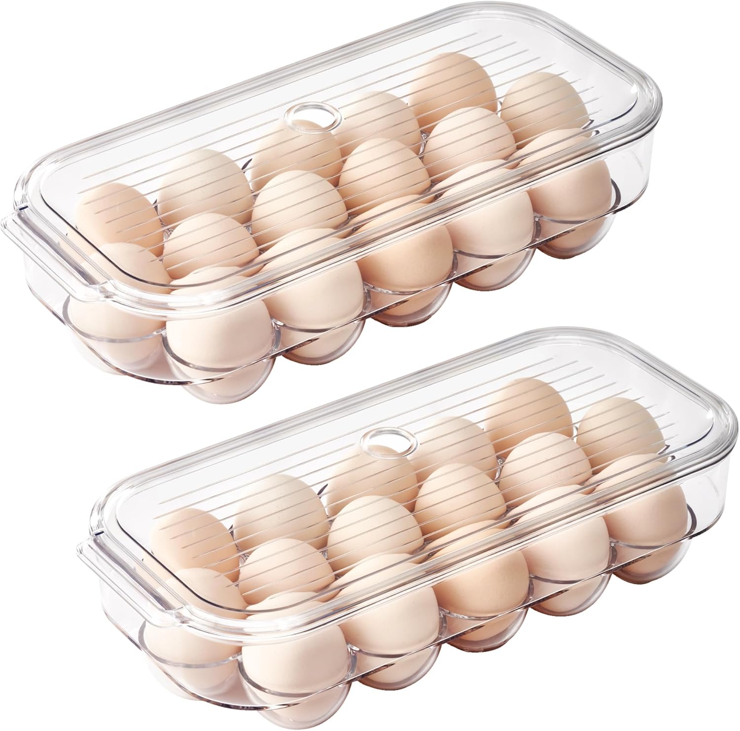 vacane Plastic Egg Holder for Refrigerator,Stackable Egg Holder Clear Tray with Lid,BPA-Free Egg Container Organizer Countertop Kitchen Fridge, Stores 16 Eggs - 2 Pack