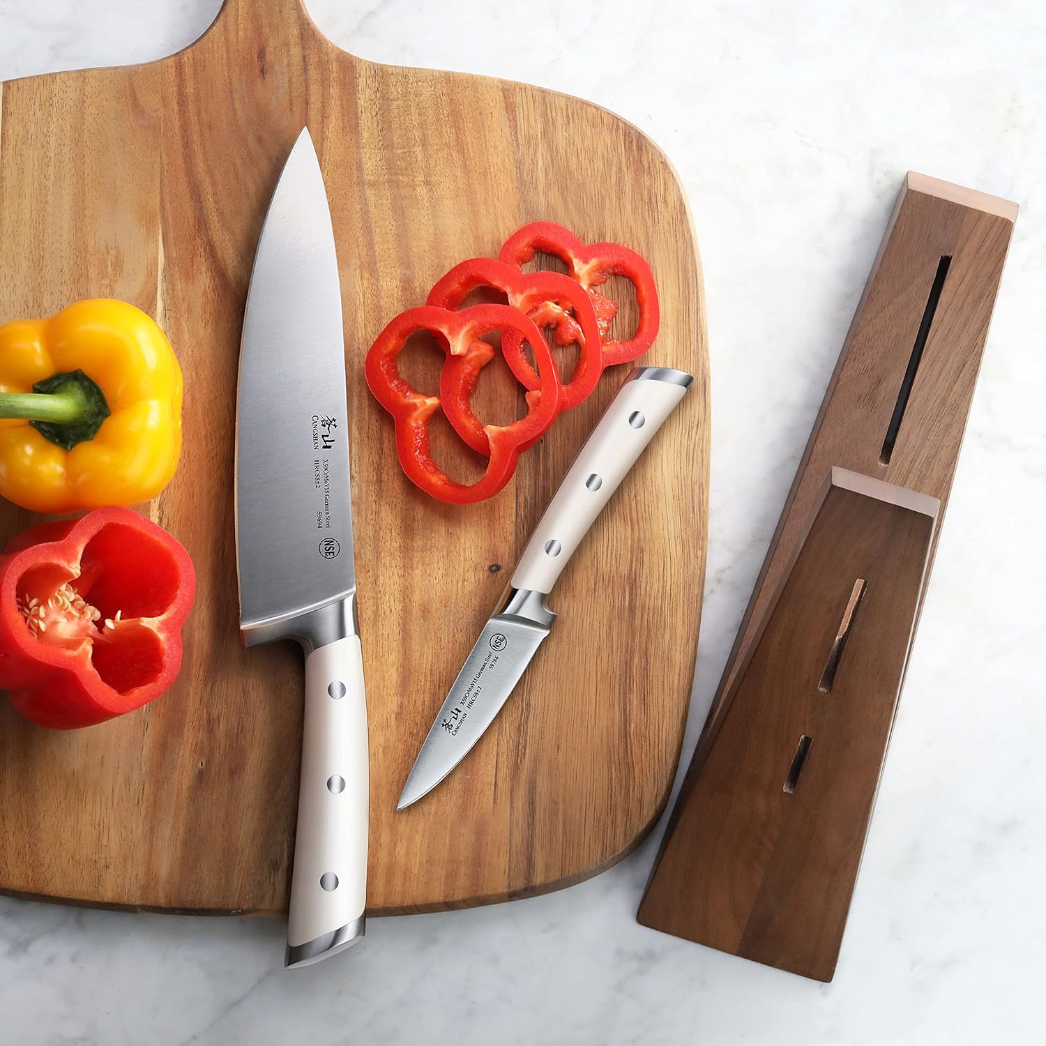 - Includes 8" Chef's Knife, 3.5" Paring Knife and Walnut Block