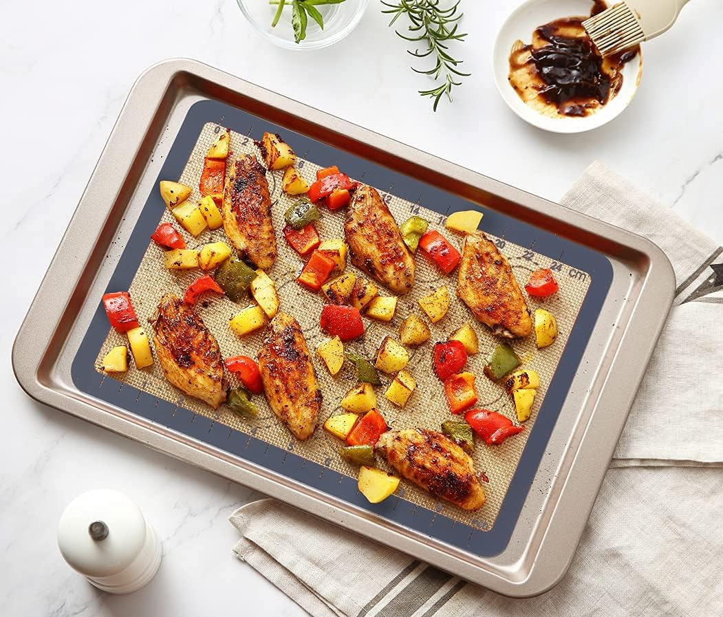 - 100% Platinum Food Grade Silicone Mat: Guanci silicone baking mat has passed the LFGB CERTIFICATION! This means that you can use it with confidence. Because incorporate fiberglass mesh inside of food grade silicone, aside from their nonstick surface, they provide even heat distribution. The baking mat will not produce peculiar smell or smoke at 482°F