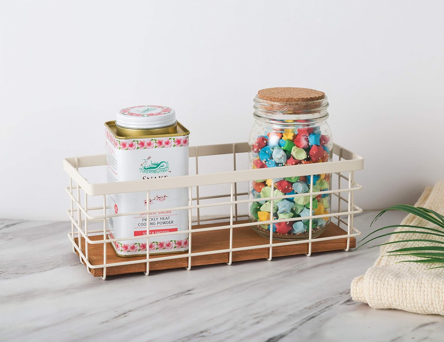 TIEYIPIN Small Metal Wire Storage Basket, Detachable Wood Base Storage Organizer Bin Basket for Kitchen Cabinets, Bathroom, Pantry, Garage, Laundry Room - Cream White