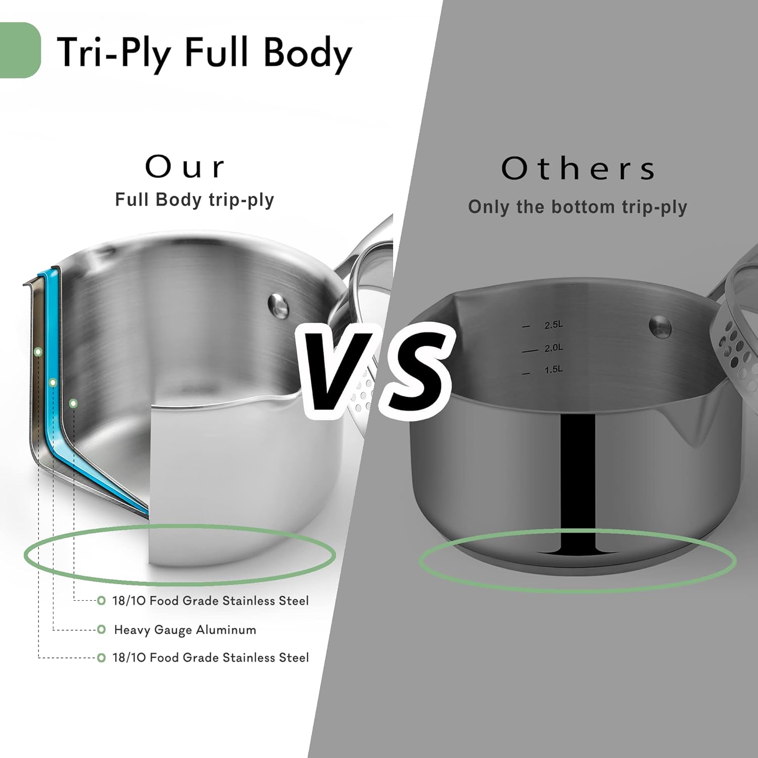 2.5 Quart Stainless Steel Pot Saucepan with Glass Strainer Lid, Sauce Pot with Two Side Spouts, Induction Cooking Pot, Multipurpose Sauce Pan with Lid for Cooking(Tri-Ply Full Body)