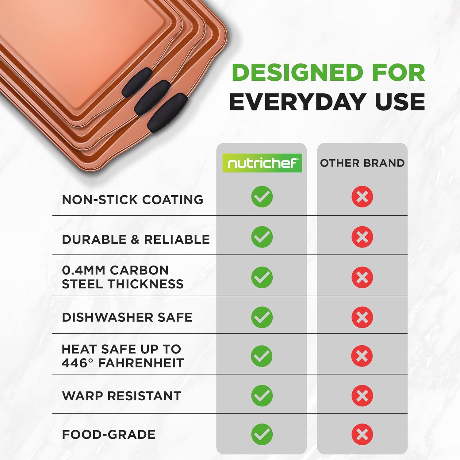 NutriChef 3 Piece Baking Pan Set - PFOA, PFOS, PTFE Free Flexible Nonstick Carbon Steel Bakeware Set - Home Kitchen Bake Pan Cookie Sheet Stackable Baking Tray Set w/Black Silicone Handles NCSBS3S45