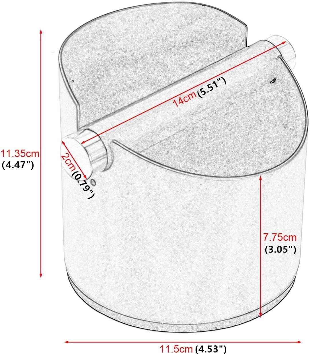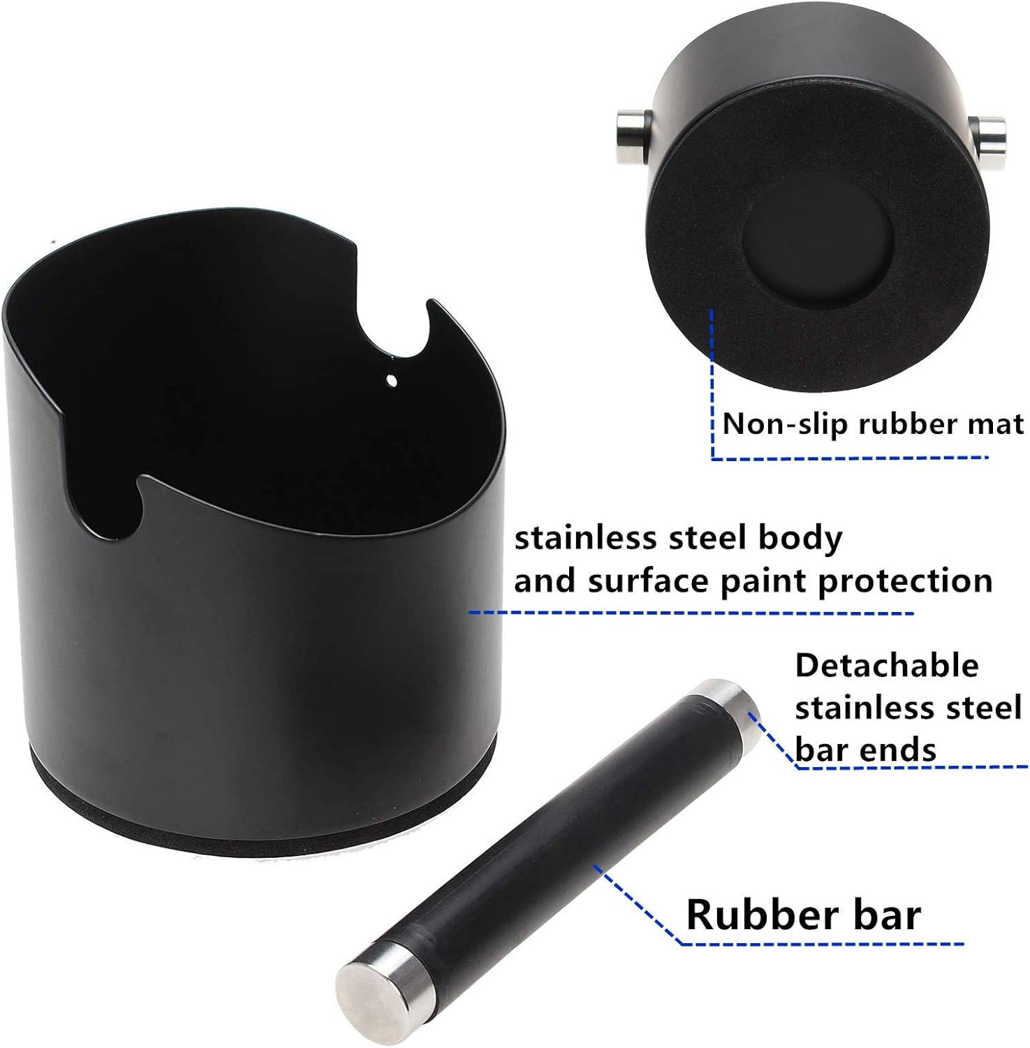 - Material: The knock box body was made of stainless steel , durable in use and not deformed. The knock bar was made of stainless steel and wrapped in rubber , won't dent or scratch your portafilter and helps eliminate spills , it keeps the portafilter safe. Rubber ring on the bottom of the coffee knock box will keep it from shifting during use, also to reduce noise, prevents sliding and won't scratch kitchen countertops
