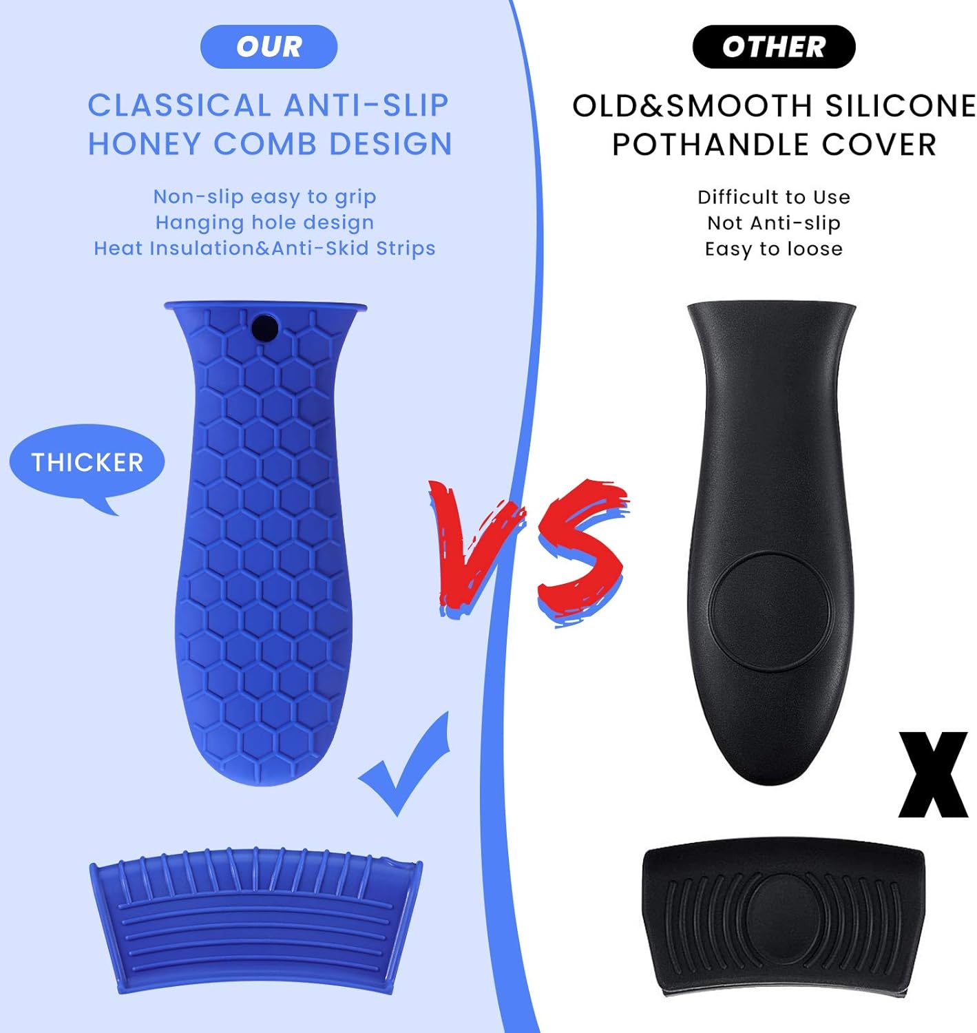 - Anti-slip design: these hot resistant pot sleeve grip handle holders feature honeycomb pattern design on the outside and concave-convex design on the inside to make the handle holder grip stronger and less slippery; The silicone hot skillet handle cover has a handy hanging hole if you prefer to store on a hook, making cooking, baking, etc. in your kitchen easier and fun