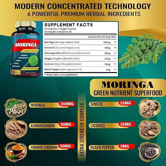 • ❤️ Professional Formula: Tenmido Moringa Capsules combination with 5 powerful herbal problematic ingredients: Turmeric, Ashwagandha, Ginger, Licorice, Black Pepper powder. With the special optimized formula, our product set comes with 2 bottles is harmonious combination of native 6 premium herbs, bring you an energetic fresh life and effect on your health.