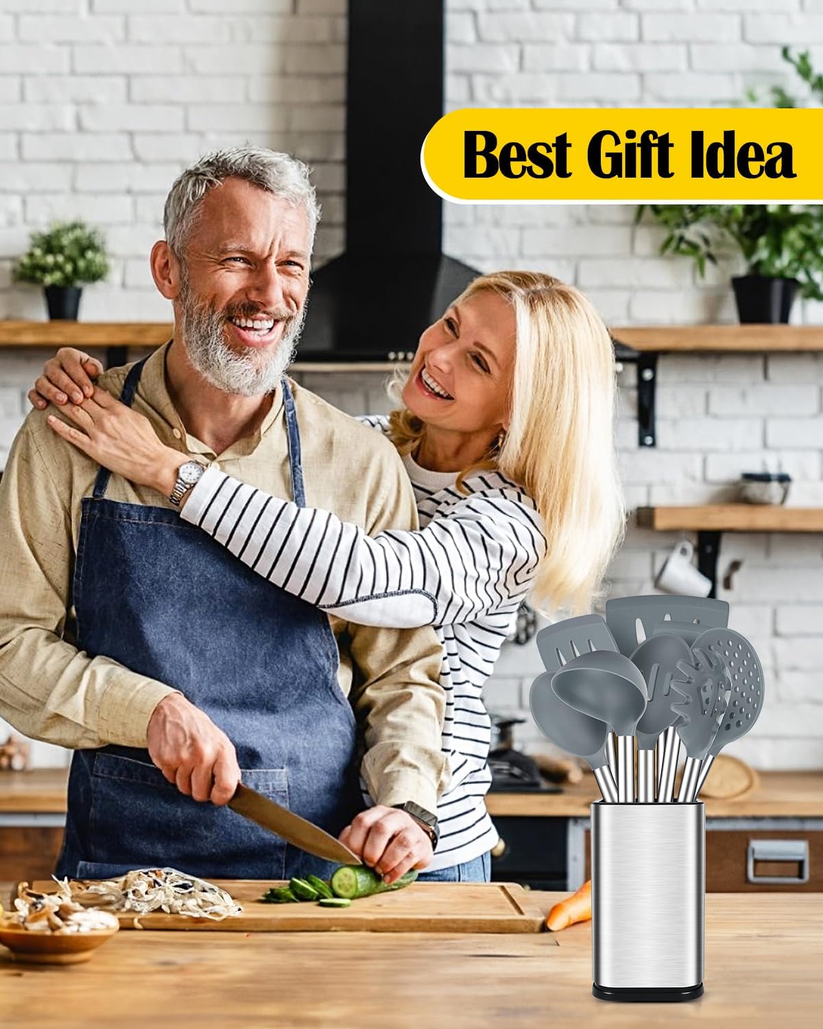 Silicone Cooking Utensil Set, 8Pcs Non-stick Cookware with Stainless Steel Handle, BPA Free Heat Resistant Kitchen Tools with Spatulas, Turnesr, Spoons, Skimer and Pasta Fork (GRAY)
