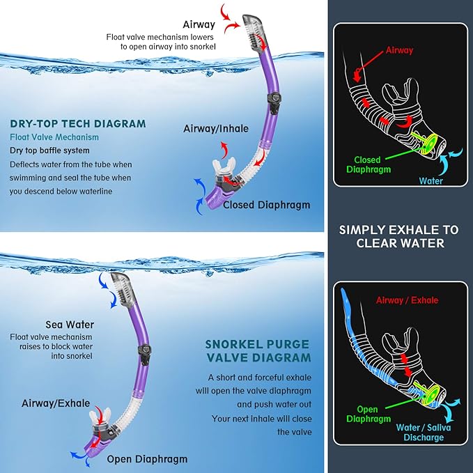 • Unobstructed breathing dry top snorkel: a high-quality snorkel with a dry-top valve that seals the breathing tube when submerged. dry top snorkel is designed to keep water from entering the breathing tube, ergonomic silicone mouthpiece is comfortable and durable. Lower purge valve allows water to be quickly expelled, so you can enjoy easy and unobstructed breathing while diving underwater.