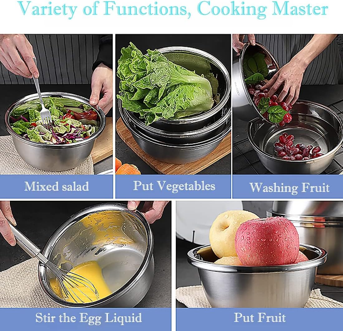 - ★【PROTECT YOUR HAND】- Our stainless steel bowl have thicken edge design,with curling,do not hurt the hand,not deformation,easy to take. Metal bowls can be used as cooking, mixing, baking, storage, serving, soup and salad bowls to meet all your kitchen needs.