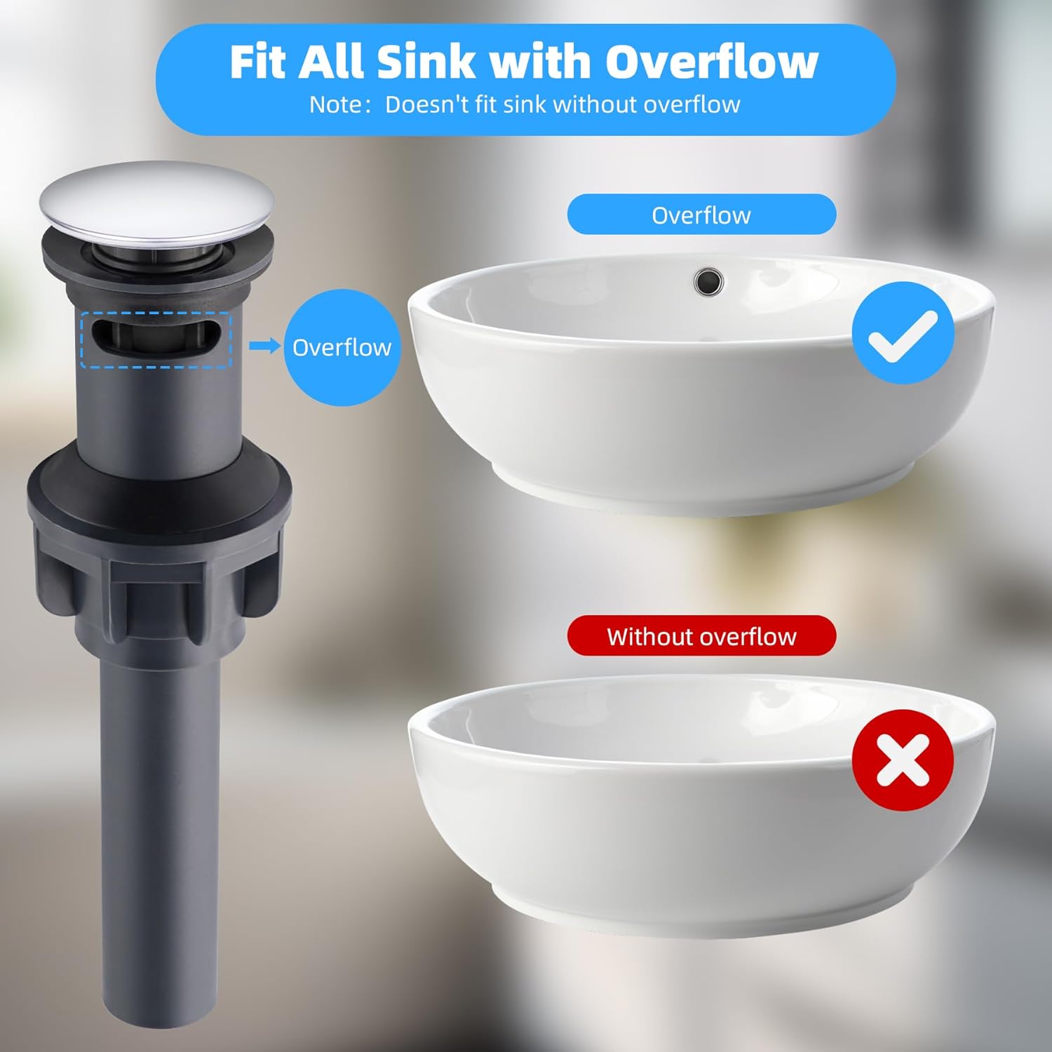 - 【Sink Drain with Overflow】This bathroom sink strainer with overflow is made of high performance ABS material with long lasting rubber material. which is specifically engineered for use with bathroom sinks that incorporate an overflow hole. The overflow design facilitates the escape of excess water, thereby mitigating the risk of water damage or flooding. However, this feature is only operational with sink drain assemblies that include an overflow mechanism. Utilizing this product in a sink devoid of an overflow hole may result in drainage, leaking problems