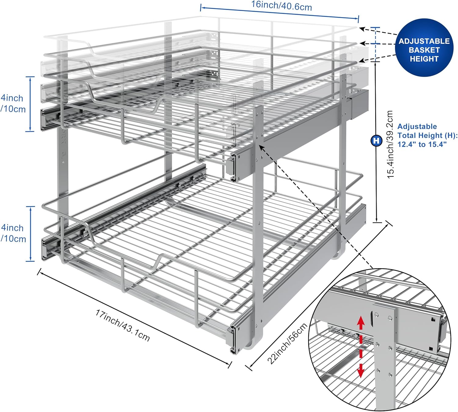 2 Tier Pull Out Cabinet Organizer 18" W X 22" D, Slide Out Drawers For Kitchen Cabinets, Pull Out Drawers For Cabinets Capacity Heavy Duty Caddy, Cabinet Pullout Shelves Chrome-Plated,Bathroom Pantry