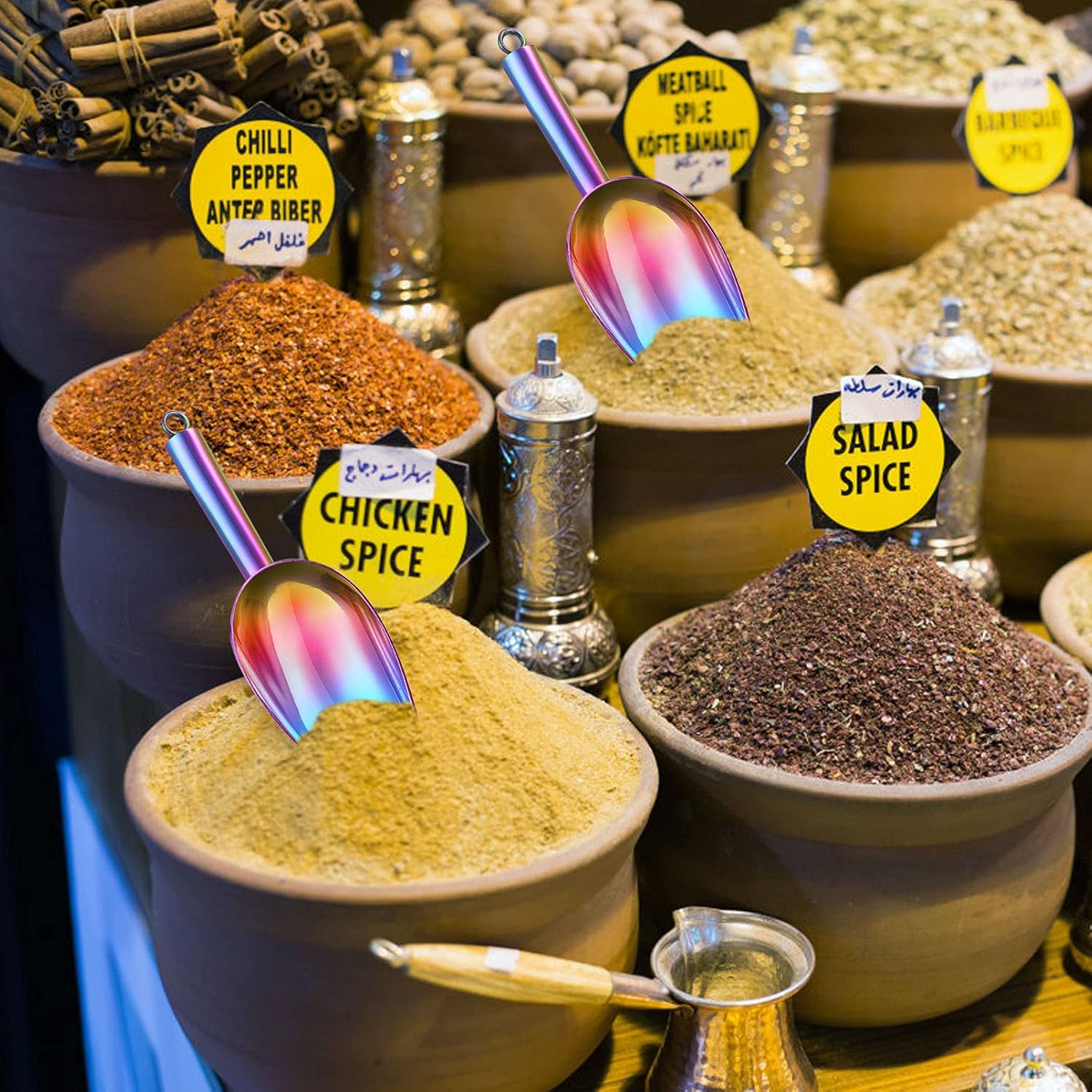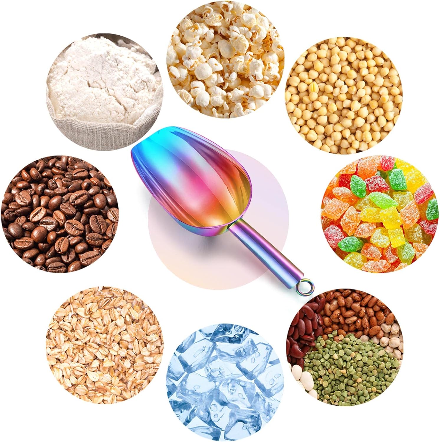 - Multi-Purpose: 5oz metal scoop, Overall length 8 inch, Bowl 4.5ββ L x 2.7ββ W x 1.5ββ H, Compact size to scoop from small bins or containers, 2 pcs meet different uses to scoop ice cubes, coffee beans, grains and flour at the same time