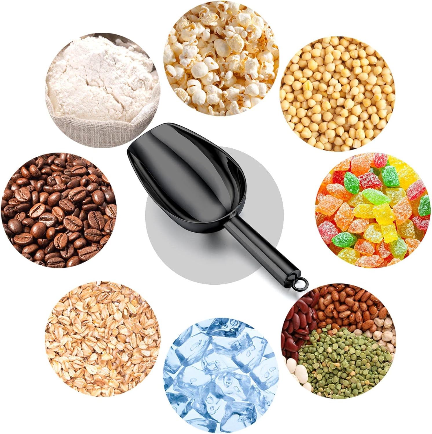 - Versatile: 5 oz capacity metal ice scoop Overall length 8 inch, Bowl 4.5ββ L x 2.7ββ W x 1.5ββ H, Ideal for scooping ice cubes, candy, coffee beans, flour, Also could be used as dog cat food scoop, Meet all your requirements