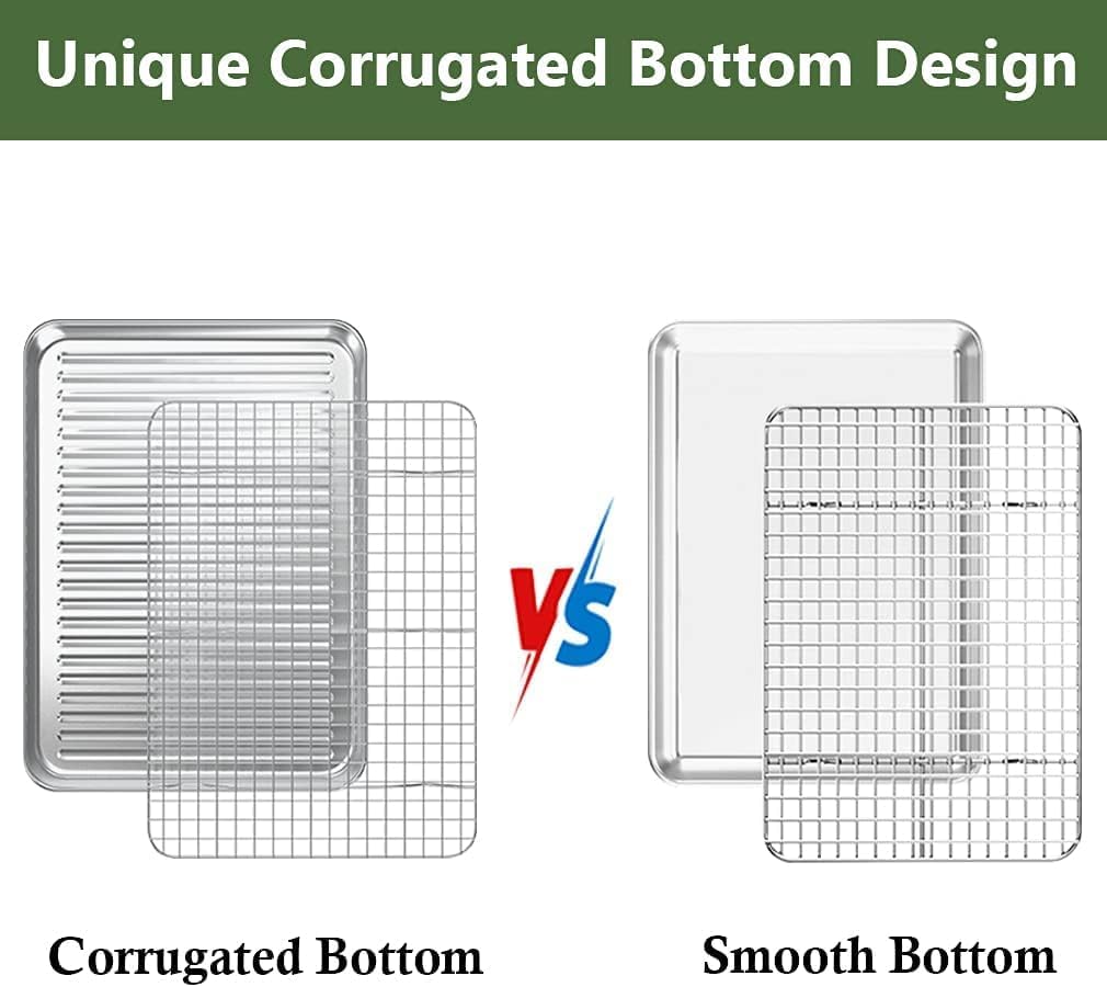 - 【Corrugated Surface】 Unique design with corrugated surface in the bottom of sheet pan, to reduce the risk of food sticking, facilitates air flow for quick release and even baking. This design also strengthen the structure to the pan for warp resistance.