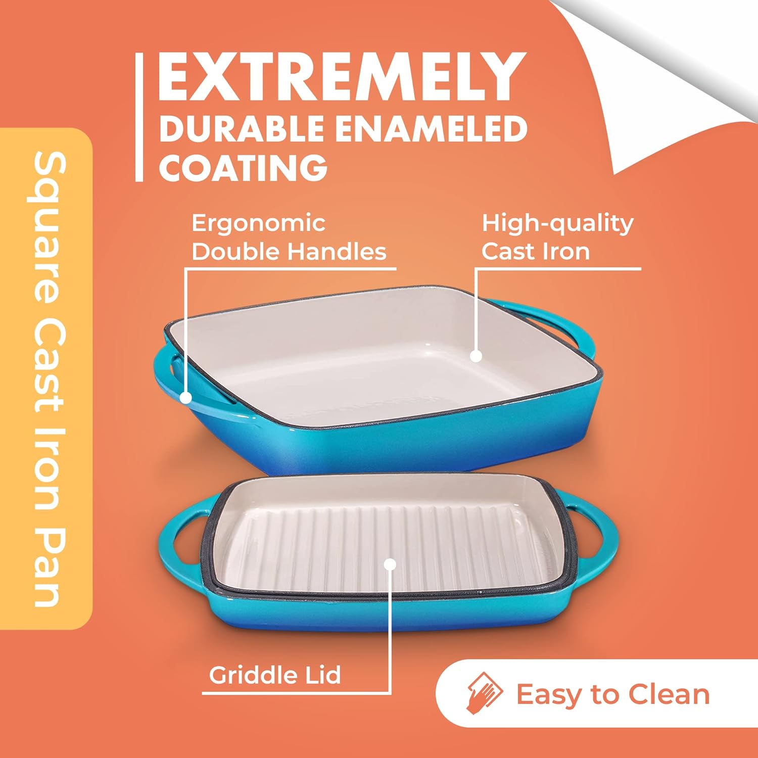 Bruntmor 2-in-1 Pre-Seasoned Square Cast Iron Dutch Oven with Dual Handles, Non Stick Pan with Grill, All-in-One Cookware Set, Cast Iron Casserole Dish with Lid for Braising Dishes,Caribbean Blue