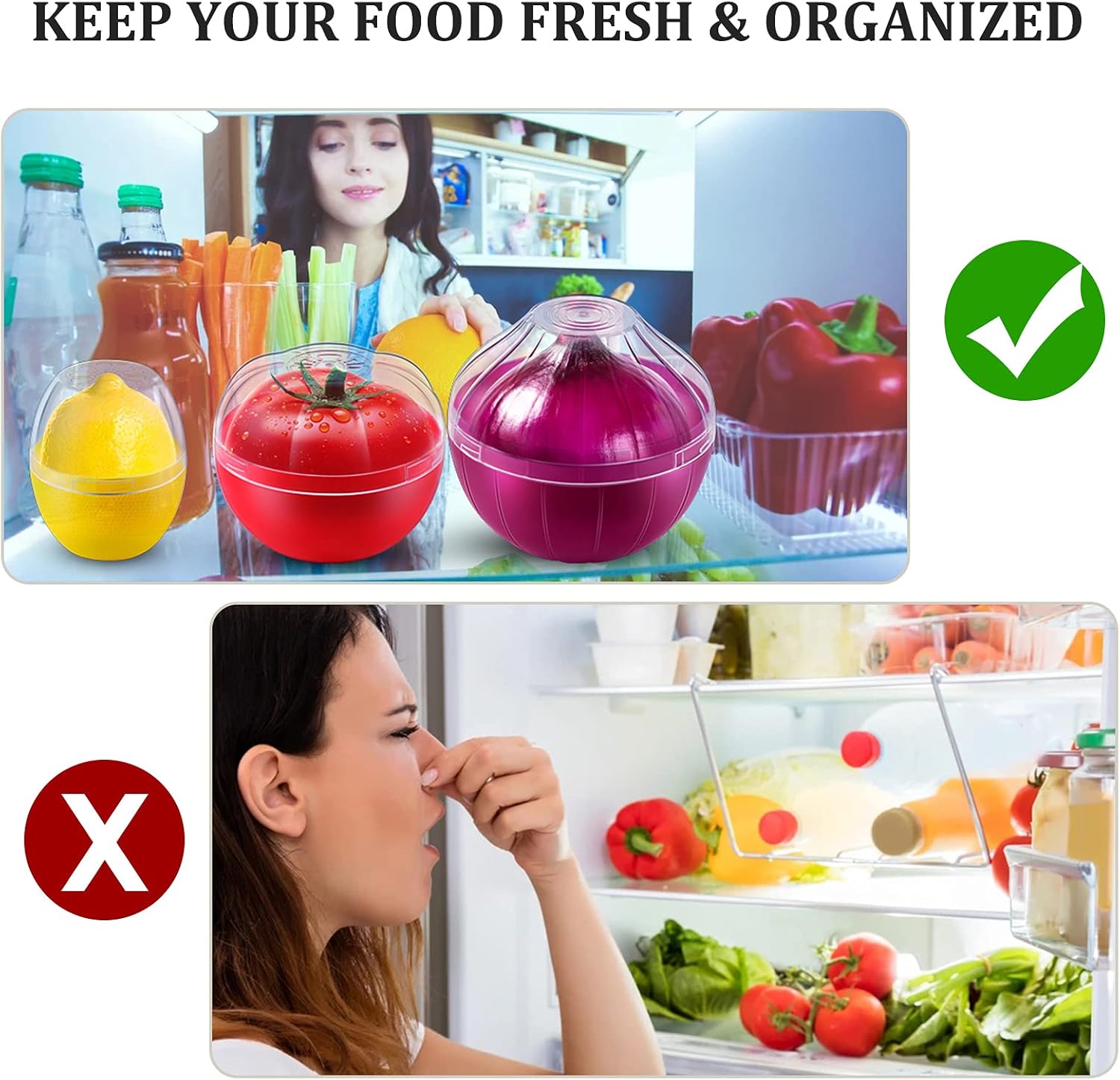 Vegetable and Fruit Storage Containers for Fridge, 4 Pcs BPA Free Reusable Food Saver - Tomato, Garlic, Onion, Lemon Keeper Holder - Refrigerator Vegetable Crisper Makes Food Stays Fresh Longer