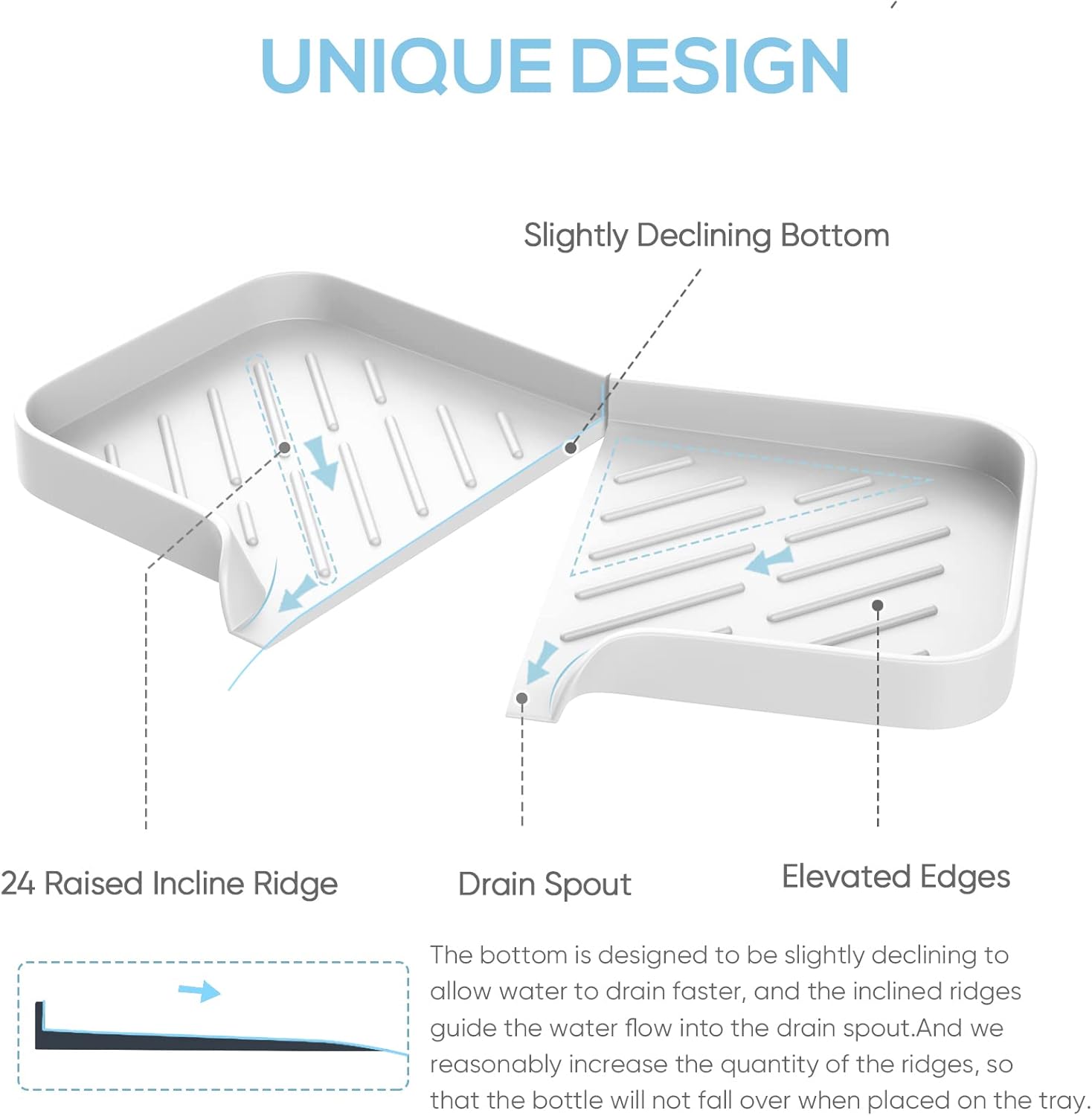 - 【Thoughtful and Unique Design】 Unique self-draining design, the bottom of the soap tray for kitchen sink is designed to be slightly declining to allow water to drain faster, the inclined ridges guide the water flow into the drain spout. And we reasonably increase the quantity of the ridges, so that the bottle will not fall over when placed on this kitchen sink storage tray organizer. All these unique features are specially designed after many tests.