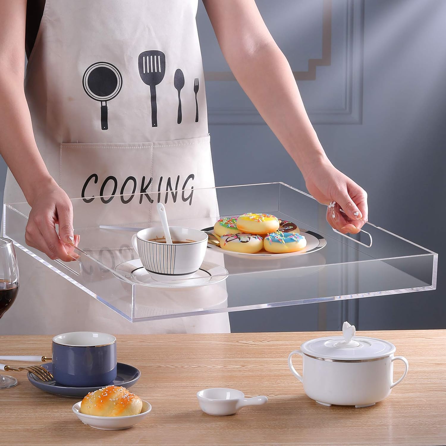 - Multifunctional: Serving tray for serving breakfast, appetizers, coffee, drinks, desserts, snacks, fruit, cheese, food; Decorative organizer tray for cosmetics, jewelry, remote, glasses, ornaments, magazines, Tray can be put on an ottoman, bed, coffee table and couch, It’s elegant to be put on any tabletop or countertop as an accessory