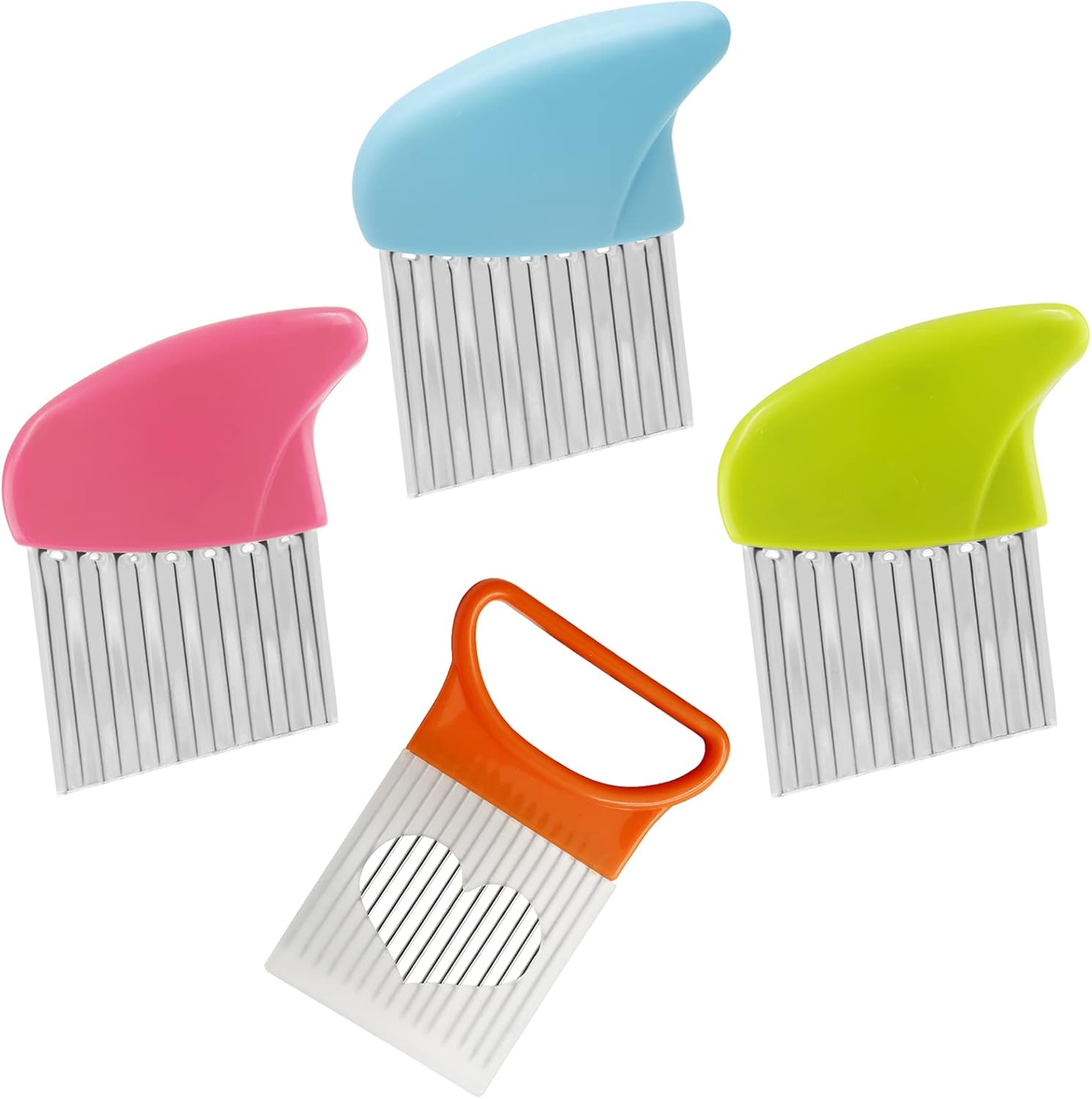 - Package Includes: 3 x wavy knife(one each for pink, green and blue), 1 x fork slicing helper; Size: 4.25" x 3.66"/ 108 x 93mm(L*W), 4.33" x 2.95"/ 110 x 75mm(L*W)
