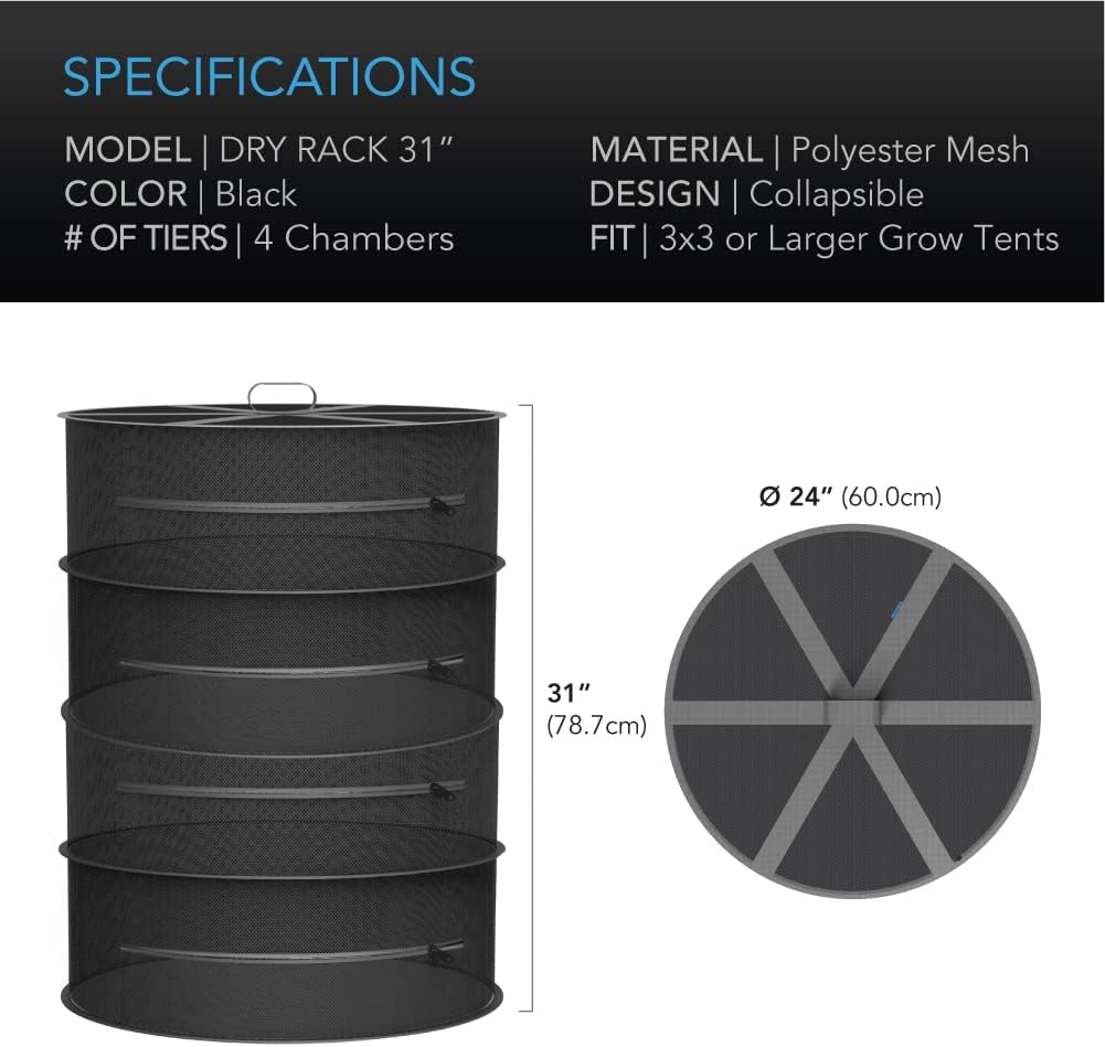 - 4 Tiers | 24 in. Diameter | Fits 3x3 or Larger Grow Tents | Includes Hanging Hook & Carrying Bag