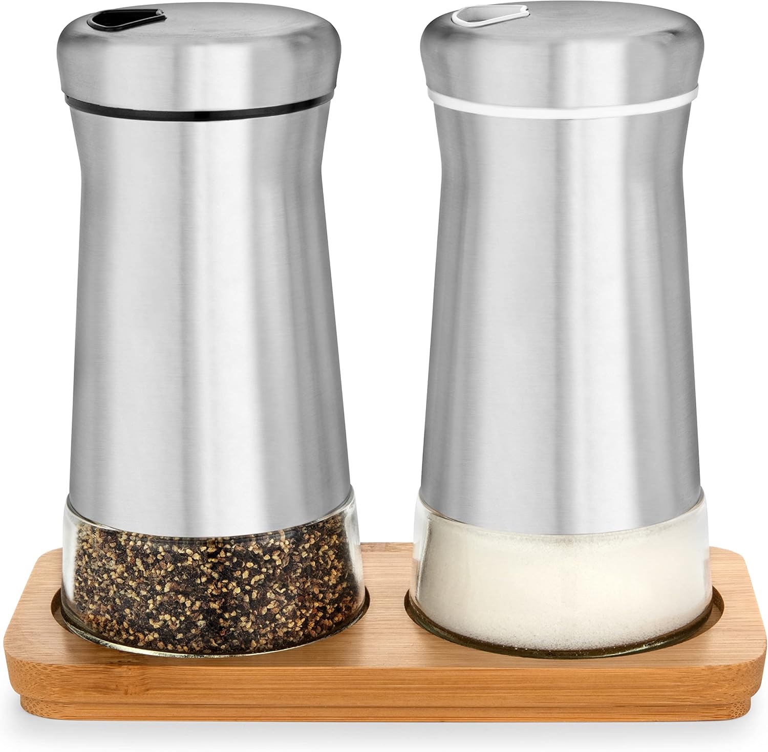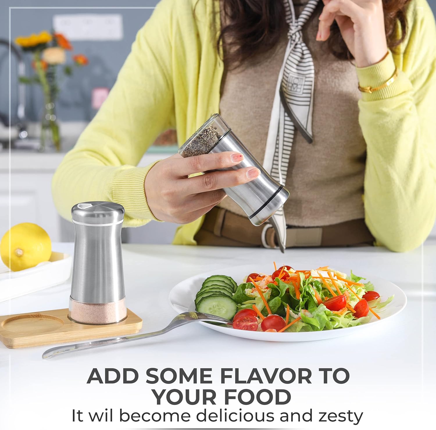 Salt and Pepper Shakers set with Adjustable Pour Holes - Elegant Stainless Steel Spice Dispenser - Perfect for Himalayan, Table Salt, White and Black Pepper (Salt & Pepper Shakers Set + Bamboo Stand)